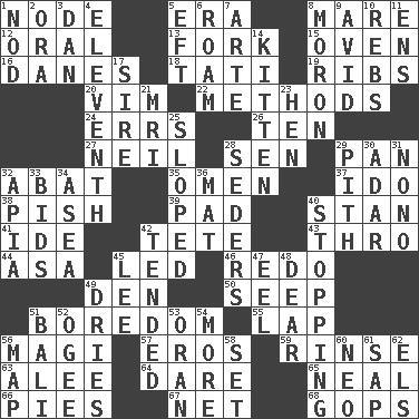 ACROSS 1. Connecting point 5. Epoch 8. Female horse 12. Spoken 13. Tined utensil 15. Baking chamber 16. Natives or inhabitants of Denmark 18. Jacques of French films 19. Chest bones 20. Zeal 22. Modes 24. Blunders 26. "___ Little Indians" 27. Famous astronaut Armstrong 28. Elected rep. 29. Baking dish 32. Blind as ____ 35. Sign of things to come 37. Wedding promise 38. Expression of disdain 39. Groovy apt. 40. Comedian Laurel of Laurel & Hardy 41. Binary compound 42. False hair 43. Through, poetically 44. White ___ sheet 45. Directed 46. Make new 49. Lair 50. Ooze 51. Mood resulting from idleness 55. Infant locale 56. Wise men 57. Greek god of love 59. Remove soap 63. Toward shelter 64. Have the gumption 65. Anneal 66. Sliced desserts 67. Fish or hair follower 68. Republicans DOWN 1. Allow head to fall sleepily 2. Mouth or opening 3. Daniel's nick name 4. Veterans Day date 5. Bank Draft (abbr.) 6. Wander aimlessly 7. Johnson of "Laugh-In" 8. Person of subnormal intelligence 9. Enthusiastic 10. Confederate soldiers (slang) 11. Followers of ems 14. Baby cat 17. Title for a man of rank and authority 21. Medical imaging device (abbr.) 23. Layer 25. Slanted 28. Spring feasts 29. Heart or essence 30. The sixth month of the Jewish calendar 31. Words to Nanette 32. Capital of Western Samoa 33. Auction offers 34. Toward the sea 36. Floor protector 40. Ceasing 42. Watched over 45. Area sheltered from the wind 47. Snakelike fish 48. Letter starter 49. Frees from moisture 51. Indonesian resort city 52. Double curve, resembling the letter S 53. Northwest Algerian city 54. Greater amount 56. Atlas unit 58. Arrange properly for use 60. Modern: prefix 61. Plant excrement 62. Raised railways