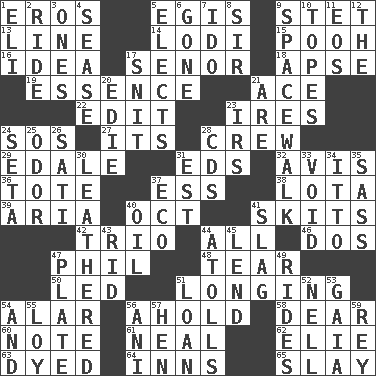 ACROSS 1. Greek god of love 5. Armor plate that protects the chest 9. Proofreading order 13. Actor's bit 14. Farming town in central California 15. "Silly old bear" 16. It may be bright or harebrained 17. Sir (Sp.) 18. Domed church section 19. Core 21. Adept person 22. Prepare for publication 23. Angers 24. Mayday 27. ___ a Wonderful Life 28. Ship's personnel 29. Peak District village in England 31. Begley and Asner 32. Deliberation 36. Lug 37. Double-curved letter 38. Globular water bottle used in Asia 39. Operatic vocal solo 40. Sep. follower 41. Burlesque acts 42. Musical group of three 44. Everything 46. Two (Sp.) 47. Silvers or Donahue 48. Pull into pieces 50. Directed 51. Yearning 54. Having or resembling wings 56. Hold, grip (Informal) 58. Letter starter 60. Make mention of 61. Actress Patricia 62. Writer Wiesel 63. Colored 64. Taverns 65. Kill DOWN 1. Connecticut Ivy Leaguer 2. Travel on or in a vehicle 3. Singles 4. Gospel singer Marvin 5. Opts 6. Went 7. Wedding promise 8. Title for a knight 9. High altitude stroll 10. Drinks excessively 11. Greek goddess of the dawn 12. Definite Article 17. In a ____ (agitated or irritated) 20. Singer Brickell 21. "We ___ not amused" (Victoria) 23. Big collection agency 24. Bristle 25. Aroma 26. Suttee (variant) 28. Music discs 30. Resembling or made to resemble leather 31. Eastern Standard Time (abbr.) 33. Null 34. "Tell ____ the Marines!" 35. Backtalk 37. Environmental prefix 40. Petroleum 41. Volcanic refuse 43. To free from 44. Ringlike coral islands and reefs 45. Grant temporary use of 47. Food holder 49. Amusement-park features 51. Grant temporary use of 52. 1994 drama film starring Jodie Foster 53. Greek goddess of the earth (variant) 54. Plus 55. Myrna of the movies 56. Cuckoo 57. Layer 59. Marina Del _, California