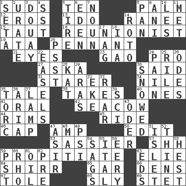 ACROSS 1. Soap bubbles 5. Nine, plus one 8. Inside of hand 12. Greek god of love 13. Wedding promise 14. The wife of a rajah (variant) 15. Pulled tight 16. One who advocates reunion 19. "One Day ___ Time" 20. Pre-World Series prize 21. Snake ____ (dice throw) 23. E Mali city 24. Adept person 27. "____ silly question..." 30. Alleged 31. A viewer who gazes fixedly 34. Mediterranean tributary 35. Falsehood 38. Proceeds 40. Washington bills 41. Taken by mouth 42. Manatee 44. Basketball hoops 45. Travel on or in a vehicle 46. Head covering 47. Electrical Unit 50. Prepare for publication 53. More impudent 57. Quiet! 59. Appease 63. Writer Wiesel 64. Bake eggs in their shells 65. Slender fish 66. Hiding places for outlaws 67. Lacquered or enameled metalware 68. Wily 69. Proofreading order DOWN 1. Bristle 2. A salt of uric acid 3. A city in N France, SE of Calais 4. Fast jet (abbr.) 5. Become fatigued 6. Locale of original sin 7. Part of speech 8. Baking dish 9. Black tropical American cuckoo 10. French article 11. Was introduced to 14. Printing process, for short 17. Tired old horse 18. _ tizzy (2 wds.) 20. Inconspicuous attention getter 22. Artist's stands 24. Ache 25. Cause heat under the collar 26. Lyric poems 28. Krazy ___ of comics 29. Ancient river in northeast Turkey 30. Frozen precipiation fell 32. Supplement with great effort 33. Rump 35. Torque (variant) 36. Operatic vocal solo 37. Desk light 39. _-fi 43. River in Europe 47. SW Saudi Arabia district 48. Floor protector 49. 23rd letter of the Greek alphabet 51. Small island 52. One or ones belonging to thee 54. Sinks 55. Slanted text style (abbr.) 56. Suggestive of the supernatural 58. Behest 59. Pacific Standard Time (abbr.) 60. 17th letter of the Greek alphabet 61. Lubricate 62. Before (prefix) 63. Begley and Asner
