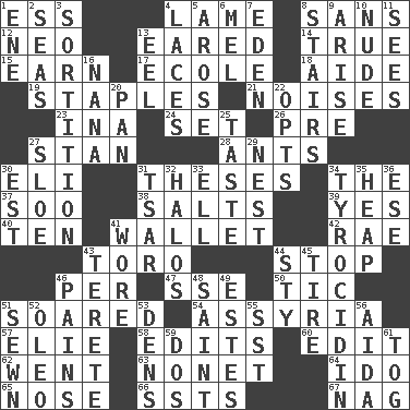 ACROSS 1. Double-curved letter 4. Unable to walk 8. Without 12. Modern: prefix 13. Having ears or earlike features 14. Loyal 15. Merit 17. Learning spot: Fr. 18. Helper 19. Paper fasteners 21. Annoying sounds 23. _ tizzy (2 wds.) 24. Put into a specified state 26. Before (prefix) 27. Comedian Laurel of Laurel & Hardy 28. Pismires 30. Biblical high priest 31. College papers 34. Definite Article 37. "Barney Miller" actor Jack 38. Table seasonings 39. It is so 40. Nine, plus one 41. Place for singles 42. Actress Charlotte 43. "Corrida" creature 44. Discontinue 46. For each 47. Compass dir. 50. Nervous spasm 51. Flew 54. Nineveh was its capital 57. Writer Wiesel 58. Prepares for publication 60. Prepare for publication 62. Gone 63. Music written for nine 64. Wedding promise 65. Olfactory organ 66. Fast planes 67. Tired old horse DOWN 1. Compass dir. 2. Oceans 3. Making a chance decision by using lots 4. Shoestrings 5. Came up 6. Cartoonist voice _ Blanc 7. Genesis locale 8. Flight of steps 9. Get up 10. Unadorned 11. Perceives with the eye 13. Snakelike fish 16. Nanny 20. Baking dish 22. Chooses 25. Clothes sense 27. A type of plum 29. Egg locale 30. Eastern Standard Time (abbr.) 31. Russian ruler of old 32. Saint headwear 33. Pipe bend 34. Polypeptide antibiotic 35. Pile 36. Compass dir. 41. Had on 43. Cylindrical with tapered ends 44. Filthy place 45. Become fatigued 46. Aches 48. Virtuous person 49. _____ Park, CO 51. Stitched 52. Margarine 53. Habitations of wild animals 55. Fast jet (abbr.) 56. Opera by Verdi 59. Two (Sp.) 61. Coat; cloak