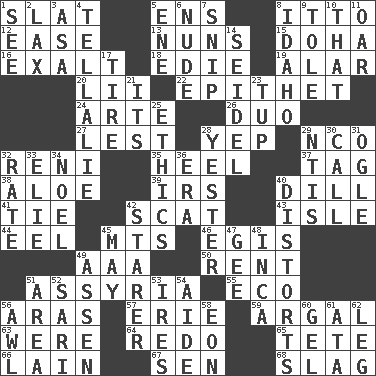 ACROSS 1. Narrow board 5. Followers of ems 8. "Tell ____ the Marines!" 12. Comfort 13. Religious women 15. Capital of the state of Qatar 16. Glorify 18. Singer Brickell 19. Having or resembling wings 20. Cards in a Roman deck? 22. Curse 24. Johnson of "Laugh-In" 26. Superhero pair 27. For fear that 28. Slangy assent 29. Non-commissioned officer (abbr.) 32. Painter Guido (1575-1642) 35. The bottom of a shoe or boot 37. Label 38. _ vera 39. Big collection agency 40. Deli pickle 41. Neckwear 42. Scram, to a cat 43. Small island 44. Snakelike fish 45. Mountains (abbr.) 46. Armor plate that protects the chest 49. Auto club (abbr.) 50. Monthly bill 51. Nineveh was its capital 55. Environmental prefix 56. Caspian sea tributary 57. 4th largest of the Great Lakes 59. Therefore, facetiously 63. We are 64. Do over again 65. False hair 66. (Had) reclined 67. Elected rep. 68. Volcanic refuse DOWN 1. Observe 2. Not strict 3. White ___ sheet 4. Copy Pinocchio 5. Compass dir. 6. Naked 7. Clip 8. Potato state 9. Lacquered or enameled metalware 10. Not this but _ 11. Rowing implement 14. A glass for beer 17. Become fatigued 21. It is 23. Uncastrated adult male sheep 25. Moral principles 28. Last 29. Nuclear Threat Initiatives 30. Give a ring to 31. Stare 32. Pace 33. Writer Wiesel 34. Christmas carol 36. Epoch 40. What propaganda does 42. A viewer who gazes fixedly 45. Can I? 47. Unit of force equal to gravity 48. South American Indian 49. NE Netherlands city 51. Length times width 52. Indian skirt 53. Angers 54. Helper 56. Leather borer 58. Age 60. Set 61. "One Day ___ Time" 62. Part of a journey