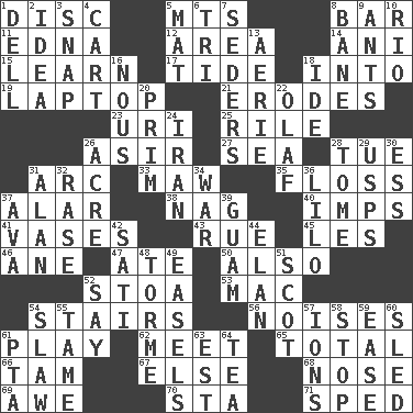 ACROSS 1. Compact _ 5. Mountains (abbr.) 8. Tavern 11. Pulitzer Prize-winning author Ferber 12. Length times width 14. Cuckoo 15. Acquire or gain knowledge or skills 17. Event that recurs at intervals 18. To the inside or interior of 19. Portable computer 21. Eats (away) 23. RI univ. 25. Cause heat under the collar 26. SW Saudi Arabia district 27. Ocean 28. Third day of the wk. 31. Curve 33. Opening into something insatiable 35. Soft thread for cleaning between teeth 37. Having or resembling wings 38. Tired old horse 40. Naughty children 41. Flower holders 43. Regret 45. French article 46. A saturated hydrocarbon 47. Had dinner 50. In addition 52. Portico 53. Apple computer (short form) 54. Flight of steps 56. Annoying sounds 61. Frolic 62. Rendezvous 65. Add up to 66. Scottish cap 67. Otherwise 68. Characteristic smell of wine 69. Deep reverence 70. R.R. building 71. Moved rapidly DOWN 1. Small valley 2. The content of cognition 3. Fastener 4. Heavy open wagon 5. Floor covering 6. Three (prefix) 7. Spring feasts 8. Object of repulsion 9. Pismires 10. _ de Janeiro 13. Nest on high 16. Good sense 18. Binary compound 20. Demure 22. Norwegian king 24. SW Asia republic 26. Measure of real estate 28. Heavy book 29. United States Postal Service (abbr.) 30. Double-curved letter 31. ____ Jay Lerner 32. To erase 34. Armed conflict 36. _ and Stitch 37. Actress Gardner 39. Island territory of the United States 42. Suttee (variant) 44. Liveliness 48. Singer Mel 49. Artist's stands 51. Native of Scotland 52. Declare 54. Cole _ (cabbage dish) 55. Not wild 57. Charged particles 58. Cease 59. Relaxation 60. Downhill vehicle 61. Parent Teacher Assoc. 63. Eastern Standard Time (abbr.) 64. Beverage made from leaves