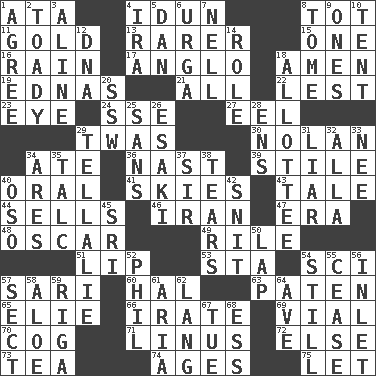 ACROSS 1. _ moment's notice (2 wds.) 4. Goddess of spring and wife of Bragi 8. Small child 11. Aureate 13. More uncommon 15. Single 16. Precipitation 17. White American of non-Hispanic descent 18. So be it 19. Ferber et al. 21. Everything 22. For fear that 23. Sight organ 24. Compass dir. 27. Snakelike fish 29. It was, poetically 30. Pitcher Ryan 34. Had dinner 36. Political cartoonist Thomas 39. Vertical member of a panel or frame 40. Taken by mouth 41. Atmospheres 43. Lie 44. Exchanges for money 46. SW Asia republic 47. Period 48. Motion picture award 49. Cause heat under the collar 51. Mouth edge 53. R.R. building 54. _-fi 57. Indian skirt 60. Actor Linden 63. Eucharist need 65. Writer Wiesel 66. Feeling or showing extreme anger 69. Small bottle 70. Gear tooth 71. "_ and Lucy" (Charlie Brown theme song) 72. Otherwise 73. Afternoon social gathering 74. Grows older 75. Allow DOWN 1. Match 2. Sycophant 3. Place in a line 4. Retirement account (abbr.) 5. One of the 12 tribes of Israel 6. Capital and largest city of Mongolia 7. 1994 drama film starring Jodie Foster 8. Heavy book 9. Singles 10. Portable shelter 12. Heredity factor (abbr.) 14. Hero or heavy, e.g. 18. One to whom something is allotted 20. Compass dir. 25. Without 26. 1973 Nobel Price Winner (Physics) Leo 28. Followers of ems 29. Copy Pinocchio 31. One who doesn't tell the truth 32. Silent film actress Nazimova 33. Born 34. Ancient Greek god of war 35. Baby powder 37. Title for a knight 38. Pulls apart 40. Bear (Spanish) 42. In a ____ (agitated or irritated) 45. _ Lanka 50. Pet locale 52. Silvers or Donahue 54. Not moving 55. Stop 56. An arm off of a larger body of water 57. Religious group 58. Medicinal plant 59. Port city in Latvia 61. Operatic vocal solo 62. Long (Scottish) 64. "___ Maria" 67. Third day of the wk. 68. Curvy letter