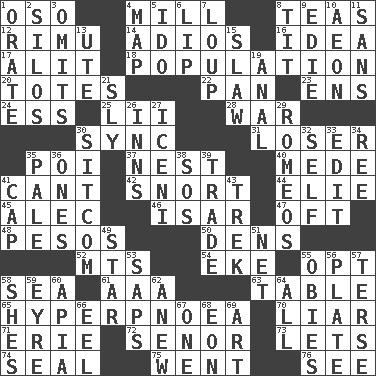 ACROSS 1. Bear (Spanish) 4. Place where flour is made 8. Afternoon social gatherings 12. Tall New Zealand timber tree 14. Goodbye (Sp.) 16. The main thing one is thinking about 17. Set down 18. Census information 20. Hauls 22. Baking dish 23. Followers of ems 24. Double-curved letter 25. Cards in a Roman deck? 28. Armed conflict 30. Synchronize (abbr.) 31. Failure 35. Luau course 37. Egg locale 40. Ancient Persian 41. Patter 42. Derisive sound 44. Writer Wiesel 45. Actor Baldwin 46. Austrian river, tributary to the Danube 47. Often (poetically) 48. Mexican monetary units 50. Habitations of wild animals 52. Mountains (abbr.) 54. Make supply last 55. Choose 58. Ocean 61. American Automobile Association (abbr.) 63. Eating place 65. Abnormally rapid or deep breathing 70. One who doesn't tell the truth 71. 4th largest of the Great Lakes 72. Sir (Sp.) 73. Allows 74. Lick closed 75. Left 76. Observe DOWN 1. Declaim 2. Grain storage towers 3. Leaves out 4. Atlas unit 5. Wedding promise 6. Mouth edge 7. Central Nebraska county 8. Teat (slang) 9. Singer Brickell 10. A really long time 11. Without 13. Shoshoni 15. Cole _ (cabbage dish) 19. Of or related to the anus 21. Secret 26. Taverns 27. Ancient Celtic tribe of eastern Britain 29. Lover boys 30. "Cheers" or "Ellen" 32. Automatic 33. Prepare for publication 34. Portuguese money of account (variant) 35. Diluted with white 36. Washington bills 38. Distress signal 39. Swap 41. Head covering 43. Long journey 49. Play the lead 51. Fish or hair follower 53. Plant excrements 55. Off-Broadway awards 56. Food holder 57. Laconic 58. "______ My Girl" (Turtles hit) 59. Jane of fiction 60. Capital of Western Samoa 62. Afresh 64. Everything 66. Snakelike fish 67. Single 68. A really long time 69. Nonscientific branch of learning