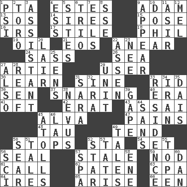 ACROSS 1. Parent Teacher Association (abbr.) 4. _____ Park, CO 9. First of billions? 13. Distress signal 14. Fathers 15. Airs 16. Big collection agency 17. Vertical member of a panel or frame 18. Silvers or Donahue 19. Petroleum 21. Greek goddess of the dawn 22. Approach 24. Backtalk 26. Ocean 27. Nick name for Arthur 29. One who uses or employs something 30. Acquire or gain knowledge or skills 31. Trig term 33. To free from 36. Elected rep. 37. Catching in a trap 40. Epoch 41. Often (poetically) 42. Part of Q.E.F. 43. Slender Brazilian palm 45. Inventor's middle name 47. Aches 48. The 19th letter of the Greek alphabet 49. Watch over 50. Obstructs or blocks passage 52. R.R. building 54. Put into a specified state 56. Lick closed 57. Having lost freshness 59. Lower and raise head in agreement 61. Give a ring to 62. Eucharist need 63. Accounting whiz (abbr.) 64. Angers 65. Originate 66. Car or cant ending DOWN 1. Air pressure measure (abbr.) 2. "Corrida" creature 3. Helper 4. Double-curved letter 5. Settings 6. Musical group of three 7. Snakelike fish 8. Compass dir. 9. Seem 10. Capital of the state of Qatar 11. SW Saudi Arabia district 12. Cartoonist voice _ Blanc 20. Den 22. NE Netherlands city 23. Born 25. Elected reps. 27. In addition 28. Coral collection 29. A single undivided whole 31. "Two Mules for Sister ____" 32. Retirement account (abbr.) 33. Dwelling 34. SW Asia republic 35. Raised platform 38. Congenital growth or mark on the skin 39. Stare wonderingly 44. Without 45. Ringlike coral islands and reefs 46. Infant locale 49. Lies 50. Shrivel 51. Falsehood 52. Play the lead 53. Jacques of French films 55. Drink excessively 56. _-fi 57. Health resort 58. Compass dir. 60. Daniel's nick name