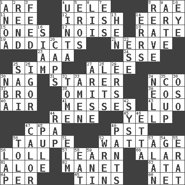 ACROSS 1. Sandy's bark 4. Ubangi River tributary 8. Actress Charlotte 11. Born 12. From or relating to Ireland 14. Suggestive of the supernatural 15. Washington bills 17. Annoying sound 18. Assign a rank or rating to 19. Inveterate users 21. Effrontery 23. American Automobile Association (abbr.) 24. Compass dir. 25. Simple or foolish person 27. Toward shelter 30. Tired old horse 31. A viewer who gazes fixedly 34. Non-commissioned officer (abbr.) 37. Sis' sibling 38. Leaves out 39. Greek goddess of the dawn 40. Atmosphere 41. Makes clutter 43. Nilotic language 44. French philosopher Descartes 45. Sharp bark 47. Numbers guy (abbr.) 49. Pacific Standard Time (abbr.) 50. Grayish beige 52. Electrical Measurement 56. Hang loosely or laxly 57. Acquire or gain knowledge or skills 60. Having or resembling wings 61. Medicinal plant 62. French painter Edouard 63. "One Day ___ Time" 64. For each 65. Metal containers 66. Fish or hair follower DOWN 1. Small Philippine buffalo 2. Tear apart 3. Nourish 4. National forest in Provo, Utah 5. Greek god of love 6. Cards in a Roman deck? 7. Double-curved letter 8. Break or tear apart 9. Johnson of "Laugh-In" 10. Sight organ 13. Layer 14. Blunders 16. Thailand, formerly 20. Smile enhancers 22. Compass dir. 25. Indian skirt 26. Russian composer Stravinsky 27. Ascend 28. Allows 29. Celtic language 30. Basketball assoc. 32. Heavy book 33. So be it 34. 1994 drama film starring Jodie Foster 35. Clever action or accomplishment 36. Bear (Spanish) 42. System (abbr.) 44. Strike 46. Singer James 47. Bodily heat indicating an inflammation 48. Whine 49. Leg coverings 50. Lacquered or enameled metalware 51. Shade tree 52. Songbird 53. Actor Alda or Thicke 54. Yard entry 55. Part of Q.E.F. 56. Infant locale 58. Erode 59. Cuckoo