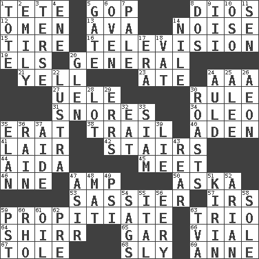 ACROSS 1. False hair 5. Grand Old Party 8. "Vaya con ____" 12. Sign of things to come 13. Actress Gardner 14. Annoying sound 15. Become fatigued 16. Household entertainment appliance 19. Raised railways 20. Commissioned military rank 21. Shout 23. Had dinner 24. Auto club (abbr.) 27. Ubangi River tributary 30. General guideline 31. Sounds asleep 34. Margarine 35. Part of Q.E.F. 38. Hang back 40. An important port of Yemen 41. Den 42. Flight of steps 44. Opera by Verdi 45. Rendezvous 46. Compass dir. 47. Electrical Unit 50. "____ silly question..." 53. More impudent 57. Big collection agency 59. Conciliate 63. Musical group of three 64. Bake eggs in their shells 65. Slender fish 66. Small bottle 67. Lacquered or enameled metalware 68. Stealthy 69. Queen of England 1702-14 DOWN 1. Lug 2. Poet Dickinson 3. Laconic 4. Compass dir. 5. Yard entry 6. Baking chamber 7. Light colored 8. Two (Sp.) 9. One more than two 10. Bear (Spanish) 11. Elected rep. 14. The longest river in the world 17. Period 18. Large container 20. Small, secluded valley 22. A period of five years 24. Old (Scot.) 25. Toward shelter 26. A really long time 28. Car dealer's back yard 29. Blunders 30. Exposes to great heat 32. Consume 33. Thailand, formerly 35. Style 36. Precipitation 37. Helper 39. Untruth 43. Hitchcock's "____ Window" 47. SW Saudi Arabia district 48. Floor covering 49. 23rd letter of the Greek alphabet 51. Japanese brewing company 52. Believer in; advocate of (suffix) 54. Droops 55. Slanted text style (abbr.) 56. Suggestive of the supernatural 58. Not divided or shared with others 59. Pacific Standard Time (abbr.) 60. 17th letter of the Greek alphabet 61. Petroleum 62. Before (prefix) 63. Federal power corp.