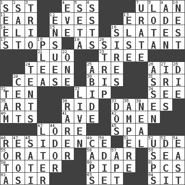 ACROSS 1. Fast jet (abbr.) 4. Double-curved letter 7. Uhlan (variant) 11. Ewer handle 12. Nights before holidays 13. Wear away 14. Biblical high priest 15. Remaining after all deductions 16. Chalkboards 17. Obstructs or blocks passage 19. Aide 21. Nilotic language 23. Relationship diagram 24. Adolescent 25. "We ___ not amused" (Victoria) 26. Help 29. Stop 30. Again 31. _ Lanka 32. "___ Little Indians" 33. Mouth edge 34. Observe 35. Nonscientific branch of learning 36. To free from 37. Natives or inhabitants of Denmark 40. Mountains (abbr.) 41. "___ Maria" 42. Sign of something about to happen 43. Old wives' tales, e.g. 45. Health resort 46. Home 51. Evade 55. Speaker 56. The sixth month of the Jewish calendar 58. Ocean 59. Carrier 60. Corncob 61. Personal Computers (abbr.) 62. SW Saudi Arabia district 63. Arrange properly for use 64. Be seated DOWN 1. Observes 2. Table seasoning 3. Musical group of three 4. Night before a holiday 5. Bristle 6. Fast planes 7. A salt of uric acid 8. Globular water bottle used in Asia 9. An important port of Yemen 10. Egg locale 12. Follows as a consequence or result 13. Otherwise 16. Founders of families 18. Entreaty 20. Empty completely 22. Single 24. Portable shelters 25. Remain 26. NE Netherlands city 27. Angers 28. Pass on 29. An absolute certainty 32. Scottish cap 33. Make or become more lively 36. More uncommon 37. Two (Sp.) 38. Electrical Unit 39. Actress Patricia 43. 61 cubic inches 44. Aroma 46. Roll call or roster of names 47. Greek god of love 48. Suttee (variant) 49. Smile enhancers 50. Singer Brickell 52. United States Postal Service (abbr.) 53. Tenth: prefix 54. 90 degrees 57. Fitting