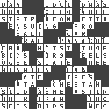 ACROSS 1. 24 hours 4. Locales 8. Mouths or openings 12. Mouth or opening 13. Margarine 14. Short-tailed, large-bodied rat 15. Empty completely 18. A really long time 19. Singer James 20. Taking place subsequently 22. Adept person 23. Table seasoning 24. Auto 25. Actress Charlotte 26. Flamboyance 30. Epoch 33. Damp 36. Son of Odin 37. Auction offers 39. Big collection agency 40. Snakelike fish 41. Double curve, resembling the letter S 42. Chalkboard 44. To separate or throw off 45. Simpletons 47. Experiment locale 50. Had dinner 51. Angers 53. _ moment's notice (2 wds.) 54. Leopard's kin 57. Grain storage tower 59. American tennis player Robert 61. Moving about 63. Baltic tributary 64. SW Asia republic 65. Wedding promise 66. Perceives with the eye 67. "Vaya con ____" 68. Modern: prefix DOWN 1. Two (Sp.) 2. Johnson of "Laugh-In" 3. Entertaining tales 4. Grant temporary use of 5. Cassini of fashion 6. Corporate head (abbr.) 7. Electrically charged atom 8. Make much ado about nothing 9. Printing process, for short 10. The first octave above the treble staff 11. Ocean 16. Austrian river, tributary to the Danube 17. Monetary unit of Botswana 21. A distinct part 22. Baking dish 24. Feline 26. Inconspicuous attention getter 27. "Mermaids" star 28. Opening into or through something 29. Celtic language 30. Inky black, to poets 31. Swiss mountan, "Queen of the Mountains" 32. An important port of Yemen 34. Petroleums 35. Lyricist Gershwin 38. Legislators 42. Observe 43. Writer Wiesel 46. Call ___ day 48. Type of rug 49. Antes 52. Smooth fabric 53. Toward shelter 54. US Secretary of Labor Elaine L. _ 55. Coop moms 56. Flintstone garb 57. Distress signal 58. Binary compound 59. Assist 60. _ Lanka 62. Friend of Pooh