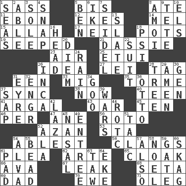 ACROSS 1. Backtalk 5. Again 8. Had dinner 11. Inky black, to poets 12. Makes supply last 14. Cartoonist voice _ Blanc 15. Assad's deity 17. Famous astronaut Armstrong 18. Cooking vessels 19. Oozed 21. Hyrax 23. Atmosphere 25. Needle case 26. The main thing one is thinking about 27. Flowery wreath 28. Label 31. Car or cant ending 33. Russian fighter aircraft 35. Singer Mel 37. Synchronize (abbr.) 38. At this time 40. Adolescent 41. Therefore, facetiously 43. Rowing implement 45. "___ Little Indians" 46. For each 47. One (Scot) 50. Printing process, for short 52. Muslim summons to prayer 53. R.R. building 54. Most capable 56. Gives out a loud, resonant sound 61. Entreaty 62. Johnson of "Laugh-In" 65. Loose outer garment 66. Actress Gardner 67. Path through which fluid escapes 68. Stalk of a moss capsule 69. Male parent 70. She-sheep 71. Cassini of fashion DOWN 1. Oceans 2. Competent 3. Not divided or shared with others 4. Fastener 5. Benjamin's nick name 6. Mamie's mate 7. A glass for beer 8. Mine, in Marseilles 9. Wig 10. Raised railways 13. Schedule 16. Froth on beer 18. 23rd letter of the Greek alphabet 20. South Vietnam president (1954) 22. Set or collection 24. Water falling in drops from the sky 26. South American Indian 28. Family _ (genealogy) 29. So be it 30. Commissioned mil. rank 31. Jane of fiction 32. Engineer (abbr.) 34. Thick or sticky substance 36. Von Bismarck 37. Plant excrement 39. Armed conflicts 42. Goldbrick 44. College mil. group 48. Relating to the nose 49. Main course 51. Baby powder 52. Chicken ___ king 54. Inventor's middle name 55. Necklace unit 57. In addition 58. Christmas carol 59. Yard entry 60. Heroin 61. Groovy apt. 63. The 23rd letter of the Hebrew alphabet 64. Supplement with great effort