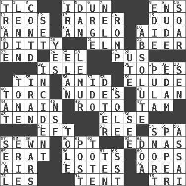 ACROSS 1. Affectionate concern, for short 4. Goddess of spring and wife of Bragi 8. Followers of ems 11. Vintage cars 13. More uncommon 15. Superhero pair 16. Singer Murray 17. White American of non-Hispanic descent 18. Opera by Verdi 19. Short, simple song 21. Shade tree 22. Fermented drink made from hops 23. Conclusion 24. Snakelike fish 27. Tenth month of the Hindu calendar 29. Small island 30. Drinks excessively 34. Metal container 36. Among 39. Dodge 40. Torque (variant) 41. Unclothed pictures 43. ____ Bator 44. With great haste 46. Printing process, for short 47. Scottish cap 48. Is inclined (to) 49. Otherwise 51. Newt 53. To riddle 54. Health resort 57. Stitched 60. Choose 63. Ferber et al. 65. Part of Q.E.F. 66. Plunders 69. I made a mistake 70. Atmosphere 71. _____ Park, CO 72. Type of rug 73. French article 74. Portable shelter 75. Three (prefix) DOWN 1. Exchange 2. Soviet premier 1918-24 3. Continued (abbr.) 4. Retirement account (abbr.) 5. Daniel's nick name 6. Goad 7. 1994 drama film starring Jodie Foster 8. Singer Brickell 9. Naked 10. Fly high 12. Arrange properly for use 14. Play 18. Utter; complete 20. It is so 25. Enthusiasm 26. Arboreal primate 28. Shoshoni 29. Event 31. Monetary unit of Botswana 32. Dutch treat 33. Elected rep. 34. Heavy book 35. SW Asia republic 37. Wedding promise 38. Prevent from occurring 40. Make lace 42. Flatfish 45. Science/research agcy. 50. Observe 52. Lacquered or enameled metalware 54. Derisive sound 55. Some stationery 56. Slender Brazilian palm 57. Lick closed 58. 4th largest of the Great Lakes 59. Armed conflicts 61. Mail 62. Carryall 64. ___ good deed 67. Nine, plus one 68. Fast jet (abbr.)