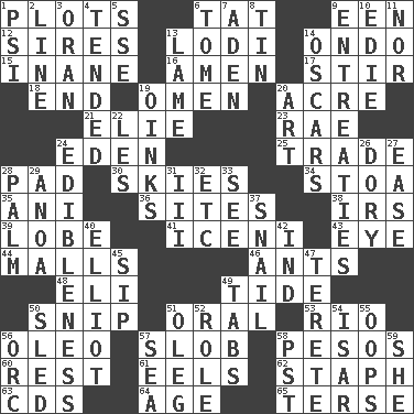 ACROSS 1. Graphs 6. Make lace 9. Car or cant ending 12. Fathers 13. Farming town in central California 14. Southwest Nigerian state 15. Empty; void 16. So be it 17. Use a swizzle stick 18. Conclude 19. Sign of things to come 20. 43,560 square feet 21. Writer Wiesel 23. Actress Charlotte 24. Paradise 25. Exchange 28. Groovy apt. 30. Atmospheres 34. Portico 35. Cuckoo 36. Settings 38. Big collection agency 39. Ear part 41. Ancient Celtic tribe of eastern Britain 43. Sight organ 44. Promenades 46. Pismires 48. Connecticut Ivy Leaguer 49. Periodic rise and fall of the sea level 50. Sever or remove by pinching or nipping 51. Spoken 53. _ de Janeiro 56. Margarine 57. Messy guy 58. Mexican monetary units 60. Respite 61. Snakelike fish 62. Staphylococcus 63. Music discs 64. Mature 65. Laconic DOWN 1. 23rd letter of the Greek alphabet 2. Actor's bit 3. NW Algerian seaport 4. Watched over 5. Compass dir. 6. Heavy book 7. Arabian gulf 8. Metal container 9. Pleas 10. Singer Brickell 11. Not either 13. Unable to walk 14. Motion picture awards 19. Pig sounds 20. Nonscientific branch of learning 22. French article 24. The property of being fit to eat 26. Rowboat 27. Comfort 28. Inside of hand 29. Small Philippine buffalo 31. One more than two 32. And so on (abbr.) 33. Perceive with the eye 37. Slow-paced one 40. American author Paul (1891-1958) 42. Indiana (abbr.) 45. Small drink 47. Cylindrical with tapered ends 49. Bar bills 50. Downhill vehicle 51. Cassini of fashion 52. Hero or heavy, e.g. 54. Austrian river, tributary to the Danube 55. I made a mistake 56. The grampus (Milton) 57. Ocean 58. Pacific Standard Time (abbr.) 59. A female animal or person