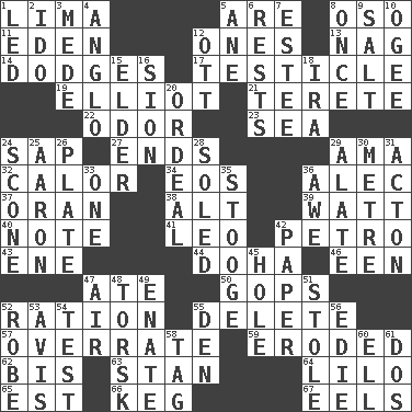 ACROSS 1. Pale green bean 5. "We ___ not amused" (Victoria) 8. Bear (Spanish) 11. Paradise 12. Washington bills 13. Tired old horse 14. Evades 17. A testis 19. American author Paul (1891-1958) 21. Cigar-shaped 22. Scent 23. Ocean 24. Plant excrement 27. Extremities 29. Housemaid (var.) 32. Bodily heat indicating an inflammation 34. Greek goddess of the dawn 36. Actor Baldwin 37. Northwest Algerian city 38. The first octave above the treble staff 39. Electrical Unit 40. Short letter 41. Lion 42. Stone: prefix 43. Compass dir. 44. Capital of the state of Qatar 46. Car or cant ending 47. Had dinner 50. Republicans 52. Food allowance for one day 55. Erase 57. Make much ado about nothing 59. Worn away 62. Again 63. Comedian Laurel of Laurel & Hardy 64. _ and Stitch 65. Eastern Standard Time (abbr.) 66. Barrel 67. Snakelike fish DOWN 1. Directed 2. Wedding promise 3. Ancient Persian 4. White American of non-Hispanic descent 5. A saturated hydrocarbon 6. Musical pauses 7. First name in cosmetics 8. Single time 9. Table seasoning 10. Double curve, resembling the letter S 12. Baseball player Mel 15. A person who is older than you are 16. The Jewish people; Israel 18. Retirement account (abbr.) 20. Severe or trying experience 24. Biscuitlike quick bread 25. Composer Copland 26. Food holder 28. Having a sole or soles 29. Having winglike extensions 30. Distance measurement (Brit.) 31. Gambison 33. Single 35. Moe Howard, for one 36. Deep reverence 42. Some stationery 45. Hollow 47. Wind 48. Cod relative 49. Related on the mother's side 51. Fur scarf 52. Loose flowing garment 53. Opinion 54. Trial 55. Lair 56. Singer Brickell 58. Label 60. Pipe bend 61. Two (Sp.)