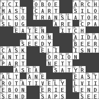 ACROSS 1. One more than ninety 4. Mitch Miller's instrument 8. Bowlike part 12. Vertical spar for supporting sails 14. Haul 15. Grain storage tower 16. In addition 17. Interpreter 20. A hard, heavy blow 21. "We ___ not amused" (Victoria) 22. Accounting whiz (abbr.) 23. Ingested 27. Hankering 29. Picture 31. Opera by Verdi 34. Sleazy 35. Fermented drink made from hops 36. Keg 39. Biblical high priest 41. Is not 42. Opposed to 43. Constellation of myth 46. Role in a play 47. Remaining after all deductions 48. Toward the sea 51. Man with strong sexual desires 54. Keyboard modifier key 56. One (Scot) 58. Compass direction 61. Rotating or pertaining to rotation 66. 57 in ancient Rome 67. Inky black, to poets 68. 4th largest of the Great Lakes 69. Grant temporary use of 70. Transmit 71. Plant excrements 72. Observe DOWN 1. Dec. holiday 2. Give a ring to 3. Come out of 4. Sep. follower 5. Tavern 6. Mouth or opening 7. Inactive volcano in Sicily 8. White ___ sheet 9. Actors Guy, Robert Welles, and Clint 10. Hoof sound 11. Israeli folk dance 13. Ancient Roman robe 18. Indian title of respect (Mr.) 19. Allow 24. Make a knot 25. Make supply last 26. Connecting point 28. Apartment or room in a ship 30. High-strength synthetic material 32. Lair 33. Nonscientific branch of learning 34. Burlesque acts 36. Head covering 37. Santa ___, CA 38. Ski resort town in Vermont 40. Angers 44. Call ___ day 45. Baseball player Mel 49. Consume 50. Black tropical American cuckoo 52. Shout 53. All-night dance parties 54. Ancient Greek god of war 55. Ear part 57. Nights before holidays 59. Trig term 60. Periodic rise and fall of the sea level 62. Added to 63. Epoch 64. Mouth edge 65. It is so