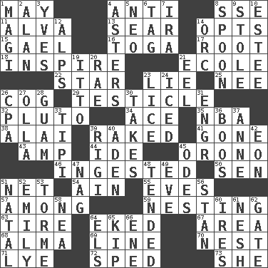 ACROSS 1. Fifth month 4. Opposed to 8. Compass dir. 11. Inventor's middle name 13. Singe 14. Chooses 15. Highlander 16. Ancient Roman robe 17. Carrot, for example 18. Heighten or intensify 21. Learning spot: Fr. 22. Play the lead 23. Falsehood 25. Born 26. Gear tooth 29. One of the two male reproductive glands 32. Mickey's pet 34. Adept person 35. Basketball assoc. 38. Jai ____ 39. Swept the length of 41. Went 43. Electrical Unit 44. Binary compound 45. U. of Maine site 46. Swallowed 50. Elected rep. 51. Fish or hair follower 54. The 18th letter of the Arabic alphabet 55. Nights before holidays 57. Amid 59. Snuggling 63. Become fatigued 64. Made supply last 67. Type of rug 68. _ mater 69. Actor's bit 70. A home for chicks 71. Potassium hydroxide 72. Moved rapidly 73. A female animal or person DOWN 1. Wise men 2. Actor Alda or Thicke 3. Jacques Cousteau's middle name 4. Michaelmas daisies 5. Modern: prefix 6. Label 7. Lyricist Gershwin 8. Soup utensil 9. Took without asking 10. First name in cosmetics 12. High mountains 14. The grampus (Milton) 19. "Tell ____ the Marines!" 20. Actress Charlotte 21. Snakelike fish 23. Louse (plural) 24. On the rocks 26. Tax preparer (abbr.) 27. Spanish pot 28. Island territory of the United States 30. Receives possession of 31. Engineer (abbr.) 33. Native american tent (variation) 36. Scornful sounds 37. Singer Murray 39. Swiss mountan, "Queen of the Mountains" 40. Arabian gulf 42. Period of immesurable duration 45. Lyric poems 47. Tired old horse 48. Watched over 49. First lady 51. Brizilian seaport 52. Poet Dickinson 53. Singer Mel 56. Comedian Laurel of Laurel & Hardy 58. Teachers' org. 60. Angers 61. Soft 62. Yard entry 64. Raised railways 65. Monetary unit of Laos 66. Compass dir.