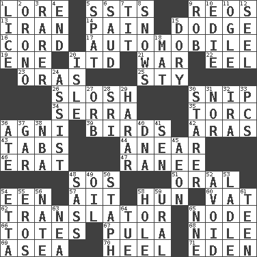 ACROSS 1. Old wives' tales, e.g. 5. Fast planes 9. Vintage cars 13. SW Asia republic 14. Ache 15. Evade 16. Drawstring 17. Car 19. Compass dir. 20. It would 21. Armed conflict 22. Snakelike fish 23. Mouths or openings 25. Filthy place 26. Agitate, as a liquid 30. Clip 34. Spanish missionary in California 35. Torque (variant) 36. Hindu god of fire 39. Avian creatures 42. Caspian sea tributary 43. Bar bills 44. Approach 46. Part of Q.E.F. 47. The wife of a rajah (variant) 48. Distress signal 51. Spoken 54. Car or cant ending 57. Small island 58. Attila the _ 60. Large container 62. Interpreter 65. Connecting point 66. Hauls 67. Monetary unit of Botswana 68. Mediterranean tributary 69. At sea 70. The bottom of a shoe or boot 71. Paradise DOWN 1. Louse (plural) 2. U. of Maine site 3. Less widely known 4. Conclude 5. Argument over a trivial matter 6. Saudi Arabian king (1953-1964) 7. Teat (slang) 8. Frozen precipitation (plural) 9. Director Reiner 10. Singer Brickell 11. Stare 12. Stitch closed the eyes of (a falcon) 15. Small, narrow, flatbottom fishing boat 18. Floor protector 20. Small island 24. Help 27. Globe 28. Indian title of respect (Mr.) 29. Ethiopian city, capital of Harari 30. A viewer who gazes fixedly 31. Not either 32. Retirement account (abbr.) 33. Personal Computers (abbr.) 36. Had dinner 37. Slender fish 38. Basketball assoc. 40. Heredity factor (abbr.) 41. Elected rep. 45. Period of immesurable duration 48. Backtalk 49. Petroleum 50. Staphylococcus 52. Shun 53. Dipping utensil 54. Singer James 55. Greek god of love 56. Nathan's nickname 58. Hollow 59. Mountain range 61. Adolescent 63. Teachers' org. 64. Third day of the wk. 65. Compass dir.