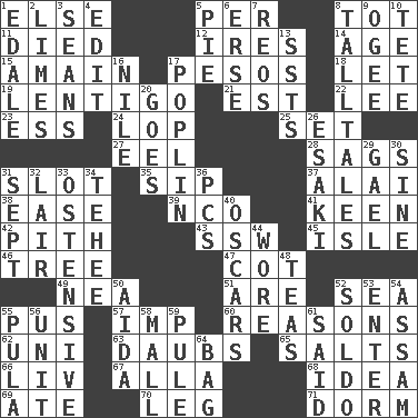 ACROSS 1. Otherwise 5. For each 8. Small child 11. Passed on 12. Angers 14. Mature 15. At full speed 17. Mexican monetary units 18. Allow 19. Small, flat, pigmented spot on the skin 21. Eastern Standard Time (abbr.) 22. Area sheltered from the wind 23. Double-curved letter 24. Chop off 25. Arrange properly for use 27. Snakelike fish 28. Sinks 31. Groove 35. Small drink 37. Jai ____ 38. Relaxation 39. Non-commissioned officer (abbr.) 41. Peachy ____! 42. Heart or essence 43. Compass dir. 45. Capri or Wight 46. Relationship diagram 47. Small bed 49. Teachers' org. 51. "We ___ not amused" (Victoria) 52. Ocean 55. Suppuration 57. Mischievous child 60. Thinks logically 62. Corn or form start 63. Applies to a surface 65. Table seasonings 66. 54 in ancient Rome 67. Silent film actress Nazimova 68. The main thing one is thinking about 69. Had dinner 70. Part of a journey 71. Dormintory (informal) DOWN 1. Peak District village in England 2. Citrus fruits 3. Actors Connery and Penn 4. Prepare for publication 5. Sliced dessert 6. Celtic language 7. Vintage cars 8. Baron Munchausen's specialties 9. Double curve, resembling the letter S 10. False hair 13. Fast planes 16. The longest river in the world 17. Cotton for raincoats, e.g. 20. Leaves 26. 1973 Nobel Price Winner (Physics) Leo 29. Highlander 30. Trig term 31. Back-to-school mo. 32. Den 33. Clearly or manifestly demonstrative 34. Giggle 36. Personal Computers (abbr.) 40. Motion picture awards 44. Had on 48. Afternoon social gatherings 50. Opera by Verdi 52. Twentieth part of a lira 53. Keyboard key 54. Indian state 55. Monetary unit of Botswana 56. A single undivided whole 58. Promenade 59. Whimper 61. Alleged 64. Paper or plastic container