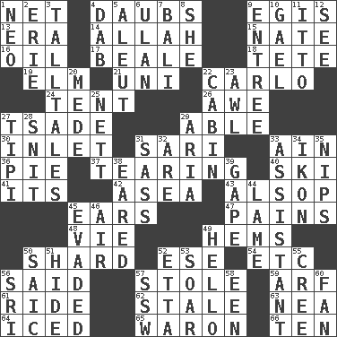 ACROSS 1. Fish or hair follower 4. Applies to a surface 9. Armor plate that protects the chest 13. Period 14. Assad's deity 15. Nathan's nickname 16. Lubricate 17. Calif. Air Force Base 18. Wig 19. Shade tree 21. University (slang) 22. Monte _, Las Vegas Hotel/Casino 24. Portable shelter 26. Deep reverence 27. Sadhe (variant) 29. Competent 30. An arm off of a larger body of water 31. Indian skirt 33. The 18th letter of the Arabic alphabet 36. Sliced dessert 37. Pulling apart 40. What Jean-Claude Killy likes to do 41. It is 42. At sea 43. Columnist Joseph or Stewart 45. Hearing organs 47. Aches 48. Compete 49. Folds over and sews together 50. Broken piece 52. Compass dir. 54. And so on (abbr.) 56. Alleged 57. Fur scarf 59. Sandy's bark 61. Travel on or in a vehicle 62. Having lost freshness 63. Teachers' org. 64. On the rocks 65. Make _____ (do battle with) 66. Nine, plus one DOWN 1. Modern: prefix 2. One of the Great Lakes 3. Baron Munchausen's specialties 4. Pat or tap gently 5. Native American of Southwest Alaska 6. ____ Bator, Mongolia 7. Indonesian resort city 8. A female animal or person 9. Main course 10. Highlander 11. "Tell ____ the Marines!" 12. Observe 20. Ancient Persian 22. Small house or cottage 23. Leather borer 25. Remaining after all deductions 27. Native american tent (variation) 28. In a ____ (agitated or irritated) 29. Roberta Peters solo 31. Backtalk 32. "We ___ not amused" (Victoria) 33. Aide 34. Image 35. Cuts off 38. Having ears or earlike features 39. Open wide 44. Unable to walk 45. Eluded 46. Wind 49. Phone greeting 50. Ketch in the Levant 51. Flintstone garb 52. Singer James 53. Fly high 55. Algonquian 56. Indian title of respect (Mr.) 57. Compass dir. 58. Car or cant ending 60. Avid follower
