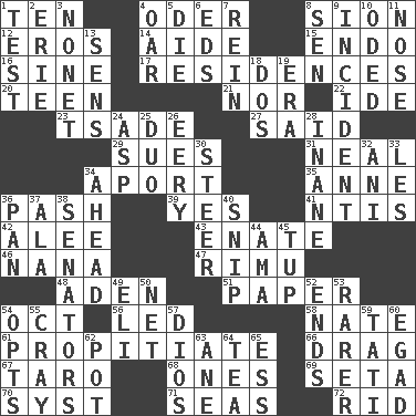 ACROSS 1. Nine, plus one 4. River in Europe 8. The Jewish people; Israel 12. Greek god of love 14. Assistant 15. Inside; within (prefix) 16. Trig term 17. Dwellings 20. Adolescent 21. Not either 22. Binary compound 23. Sadhe (variant) 27. Expressed in words 29. Takes to court 31. Actress Patricia 34. To the left, to Queeg 35. Queen of England 1702-14 36. Romantic infatuation 39. Affirmative reply 41. Nuclear Threat Initiatives 42. Toward shelter 43. Related on the mother's side 46. Nanny 47. Tall New Zealand timber tree 48. Arabian gulf 51. Some stationery 54. Sep. follower 56. Directed 58. Nathan's nickname 61. Appease 66. To draw with force 67. Edible starchy tuberous root 68. Singles 69. Stalk of a moss capsule 70. System (abbr.) 71. Oceans 72. To free from DOWN 1. Trial 2. One of the Great Lakes 3. Music written for nine 4. Rowing implement 5. Pass on 6. Begley and Asner 7. It's straight from the horse's mouth 8. Elected rep. 9. Event 10. Wrote a lyric poem 11. Olfactory organ 13. Elected reps. 18. Two (Sp.) 19. Period 24. Viper 25. Superhero pair 26. Suggestive of the supernatural 28. Empty; void 30. Navigate 32. Black tropical American cuckoo 33. French article 34. Toward the future 36. Baking dish 37. Wing 38. Elected representatives 40. Clip 44. Nanny (var.) 45. Uncastrated adult male sheep 49. Biblical high priest 50. Fish or hair follower 52. Extremities 53. More uncommon 54. Chooses 55. Supercomputer manufacturer 57. "Vaya con ____" 59. Jacques of French films 60. Mild oath 62. Plant holder 63. A saturated hydrocarbon 64. Afternoon social gathering 65. Double-curved letter