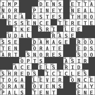 ACROSS 1. Mischievous child 4. Hiding places for outlaws 8. Singer James 12. Not either 13. Abounding in pines 14. Be tempered by heat 15. Type of rug 17. _____ Park, CO 18. Through, poetically 19. Substance 21. Cylindrical with tapered ends 23. Mamie's mate 24. Indian title of respect (Mr.) 26. Area sheltered from the wind 27. Hereditary estate 28. Raze (variant) 30. Compass dir. 31. Break 34. Friend of Pooh 37. "___ Little Indians" 38. Speak pompously 39. Begley and Asner 40. Nonscientific branch of learning 41. Sounds asleep 42. "Barney Miller" actor Jack 43. Chooses 44. SW Saudi Arabia district 46. Adept person 47. Raised railways 50. To free from 51. Fragments 54. Winter's stalactites 57. Ancient Roman robe 58. Crowbar 60. Single time 62. Northwest Algerian city 63. Baking chambers 64. Island 65. Friends 66. Portable shelter 67. Compass dir. DOWN 1. _ tizzy (2 wds.) 2. Greater amount 3. Elected leader of a country 4. Plates 5. Keyboard key 6. Born 7. System (abbr.) 8. Main course 9. Giggle 10. Small pie 11. Medicinal plant 13. Writing instrument 16. "____ silly question..." 20. Snakelike fish 22. Otherwise 25. Feeling or showing extreme anger 27. One who uses or employs something 29. Eons 30. R.R. building 31. Do not 32. Came up 33. Spoil 34. Dwelling 35. Scent 36. Bear (Spanish) 41. Broke a traffic law 43. Seas 44. Curve 45. Grain storage tower 46. Therefore, facetiously 48. Make or become more lively 49. Aroma 51. Constrict 52. Israeli folk dance 53. Notch 55. Big collection agency 56. Glance over 59. Night before a holiday 61. Sight organ