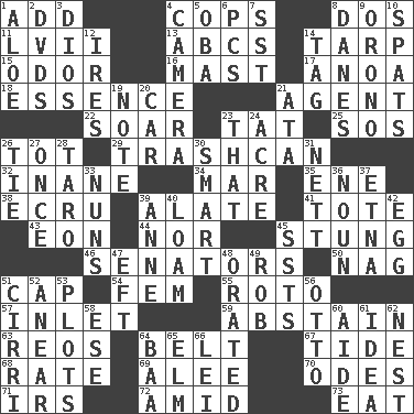 ACROSS 1. Increase 4. 911 reaches them 8. Two (Sp.) 11. 57 in ancient Rome 13. Lettered men learn these first 14. Canvas cover 15. Aroma 16. Vertical spar for supporting sails 17. Small Philippine buffalo 18. Center 21. Representative 22. Fly high 23. Make lace 25. Distress signal 26. Small child 29. File 13 32. Silly 34. Make imperfect 35. Compass dir. 38. Shade of tan 39. Having winglike extensions 41. Carry 43. Period of immesurable duration 44. And not 45. Feeling sharp psychological pain 46. Elected representatives 50. Tired old horse 51. Head covering 54. Opposite of masc. 55. Printing process, for short 57. An arm off of a larger body of water 59. Choose not to consume 63. Vintage cars 64. Waist strap 67. Periodic rise and fall of the sea level 68. Pace 69. Toward shelter 70. Lyric poems 71. Big collection agency 72. Among 73. Ingest DOWN 1. Medicinal plant 2. Movie discs 3. "Vaya con ____" 4. Device for capturing images 5. Chief or king in Benin or Nigeria 6. Personal Computers (abbr.) 7. Fast jet (abbr.) 8. Natives or inhabitants of Denmark 9. U. of Maine site 10. Arguments over trivial matters 12. Angers 14. Label 19. Short letter 20. Auto 21. "One Day ___ Time" 23. Not this but _ 24. 43,560 square feet 26. Standoff 27. At one time in the past 28. Pacific island yam 30. Don Adams' spy role 31. Remaining after all deductions 33. Religious women 36. Part of speech 37. Inactive volcano in Sicily 39. Singer Murray 40. Rich soil 42. Oval reproductive body of a fowl 45. Fast planes 47. Newt 48. Spoke pompously 49. Director Reiner 51. High-altitude cloud 52. Approach 53. Graphs 56. Von Bismarck 58. Compass dir. 60. Assistant 61. It may be bright or harebrained 62. A home for chicks 64. Sound made by sheep 65. Shade tree 66. Flowery wreath