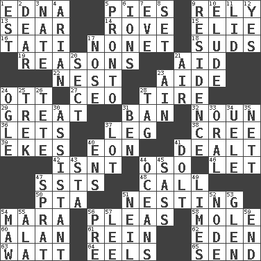 ACROSS 1. Pulitzer Prize-winning author Ferber 5. Sliced desserts 9. Depend 13. Shrivel 14. Be footloose 15. Writer Wiesel 16. Jacques of French films 17. Music written for nine 18. Soap bubbles 19. Thinks logically 21. Assist 22. Egg locale 23. Assistant 24. Baseball player Mel 27. Corporate head (abbr.) 28. Become fatigued 29. Relatively large 31. Prohibit 32. Part of speech 36. Allows 37. Part of a journey 38. Algonquian 39. Supplements with great effort 40. A really long time 41. Started a card game 42. Is not 44. Bear (Spanish) 46. Allow 47. Fast planes 48. Give a ring to 50. Parent Teacher Assoc. 51. Inhabiting a nest 54. Hindu Mythology: god of death 56. Entreaties 58. Undercover agent 60. ____ Jay Lerner 61. It's straight from the horse's mouth 62. Genesis locale 63. Electrical Unit 64. Snakelike fish 65. Transmit DOWN 1. Eastern Standard Time (abbr.) 2. Letter starter 3. Nathan's nickname 4. Believer in; advocate of (suffix) 5. Right away 6. Charged atoms 7. First lady 8. Arrange properly for use 9. Dwelling 10. Evade 11. Flaplike covering 12. It is so 17. Sense of smell 20. Religious group 21. Wind 23. The 18th letter of the Arabic alphabet 24. Stare at amorously 25. Long journey 26. Wig 28. Label 30. Helper 31. Benjamin's nick name 33. Spoken 34. Ubangi River tributary 35. Remaining after all deductions 37. Car dealer's back yard 40. Followers of ems 41. Stupid person 43. R.R. building 44. Seas 45. Backtalk 47. Small fatty European fish 49. Citrus fruits 51. Famous astronaut Armstrong 52. Thickened enlargement 53. Small, secluded valley 54. Opening into something insatiable 55. Insect wing 56. Before (prefix) 57. Area sheltered from the wind 59. Conclusion