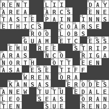 ACROSS 1. Monthly bill 5. Cards in a Roman deck? 8. 24 hours 11. Type of rug 12. Arches 14. Compass dir. 15. Clothes sense 17. Ache 18. Taverns 19. Value system 21. Rough 23. Friend of Pooh 25. Tennis shots 26. Island territory of the United States 27. And so on (abbr.) 28. Curvy letter 31. Australian flightless bird 33. Portuguese money of account (variant) 35. Remove all contents or possession from 37. Ancient river in northeast Turkey 38. Non-commissioned officer (abbr.) 40. Capital of Latvia 41. _ pole 43. Baseball player Mel 45. Car or cant ending 46. White ___ sheet 47. Compass dir. 50. Small quarrel 52. Songbird 53. Mouth or opening 54. Sunflower state 56. Eats (away) 61. Afresh 62. Ballerina skirt 65. Peak District village in England 66. Lion 67. Oceans 68. NW Algerian seaport 69. "___ Little Indians" 70. Institute legal proceedings 71. Tear apart DOWN 1. Pace 2. Part of Q.E.F. 3. Delicate 4. Jacques of French films 5. Infant locale 6. Retirement account (abbr.) 7. Tapering mass of hanging ice 8. Cub Scout units 9. Singer Murray 10. Consenting reply 13. Snout, nose 16. Shade of tan 18. Big collection agency 20. Fly high 22. Lettered men learn these first 24. Presage 26. Abrupt rush of wind 28. One of the Great Lakes 29. Attach a signature 30. Health resort 31. Greek god of love 32. Hindu Mythology: god of death 34. Environmental prefix 36. Not kosher 37. Santa ___, CA 39. Von Bismarck 42. Possessive pronoun 44. Become fatigued 48. Theater features 49. Follows as a consequence or result 51. Conductor's collection 52. Compass dir. 54. Leg joint 55. Age 57. Scent 58. Have the gumption 59. Liveliness 60. Post 61. The first octave above the treble staff 63. The 19th letter of the Greek alphabet 64. Purpose