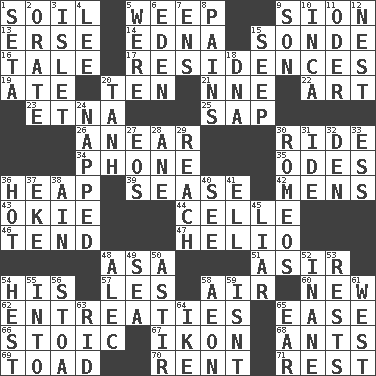 ACROSS 1. The visible part of the earth's surface 5. Shed a tear 9. The Jewish people; Israel 13. Celtic language 14. Pulitzer Prize-winning author Ferber 15. Something which is sent 16. Falsehood 17. Homes 19. Had dinner 20. Nine, plus one 21. Compass dir. 22. Nonscientific branch of learning 23. Inactive volcano in Sicily 25. Plant excrement 26. Approach 30. Travel on an animal 34. Give a jingle 35. Lyric poems 36. Pile 39. Gospel singer Marvin 42. Not women's 43. Migrant worker of the '30s 44. Cell (Danish) 46. Be inclined (to) 47. Sun: prefix 48. White ___ sheet 51. SW Saudi Arabia district 54. Part of HMS, perhaps 57. French article 58. Wind 60. ___ Haven, CT 62. Pleas 65. Comfort 66. Unemotional 67. Visual representation of an object 68. Pismires 69. Frog relative 70. Monthly bill 71. Remainder DOWN 1. Bristle 2. Declaim 3. Small island 4. Area sheltered from the wind 5. Past tense of be (plural) 6. Genesis locale 7. Followers of ems 8. Aches 9. Boy, to dad 10. South American Indian 11. Baltic tributary 12. A home for chicks 15. Ooze 18. Heredity factor (abbr.) 20. Hyperbolic tangent 24. Slept 27. Greek goddess of the dawn 28. A saturated hydrocarbon 29. Arrive at 30. Lover boys 31. Binary compound 32. Lair 33. Curvy letter 36. Being at a high temperature 37. Make supply last 38. The 18th letter of the Arabic alphabet 40. Perceive with the eye 41. Pipe bend 45. One who doesn't tell the truth 48. Actor Baldwin 49. Ocean 50. Moving about 52. Empty; void 53. Musical pauses 54. Behest 55. To the inside or interior of 56. Portico 58. A really long time 59. Is not 61. Compass direction 63. To free from 64. Eisenhower's nickname 65. Ewer handle