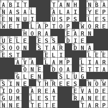 ACROSS 1. "This won't hurt ____!" 5. Hyperbolic tangent 9. Basketball assoc. 12. Rhinal 14. Jai ____ 15. Slangy assent 16. World-weariness 17. United States Postal Service (abbr.) 18. French article 19. Soggy 20. Portable computer 23. Had on 24. Israeli folk dance 25. Merit 27. Ubangi River tributary 30. Curvy letter 32. Pass on 33. Within a short period 34. Play the lead 36. Heredity factor (abbr.) 38. Eastern Standard Time (abbr.) 39. Connecticut Ivy Leaguer 40. Area sheltered from the wind 43. Actress Gardner 46. Desk light 48. One who doesn't tell the truth 49. Single 51. ___ good deed 52. Singer James 53. Small, secluded valley 54. Strike heavily 56. Trig term 58. Triplets 61. Immediately 64. Wedding promise 65. Length times width 66. Elude 68. Chewing product 69. For fear that 70. Indian princess (variant) 71. Compass dir. 72. Wig 73. Canvas cover DOWN 1. Afresh 2. Object of repulsion 3. Is not 4. The 19th letter of the Greek alphabet 5. Drawn tight 6. In addition 7. Slept 8. Part of HMS, perhaps 9. High-strength synthetic material 10. Fermented drink made from hops 11. Domed church section 13. _ and Stitch 21. Ancient Greek god of war 22. Soft color 23. Songbird 24. Layer 26. Help 27. Purpose 28. Greek goddess of the dawn 29. Globular water bottle used in Asia 31. Vegetable dish 35. Full of chinks, cracks, or crevices 37. Set down 41. Consume 42. Epoch 44. Short-tailed, large-bodied rat 45. A saturated hydrocarbon 47. Diluted with white 48. Part of a journey 50. Main course 53. Dwarf 55. One who uses or employs something 56. Attach a signature 57. Goddess of spring and wife of Bragi 59. Behest 60. Pace 61. Nanny 62. River in Europe 63. Shed a tear 65. The first octave above the treble staff 67. Large container