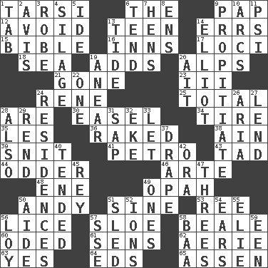 ACROSS 1. Tarsus (plural) 6. Definite Article 9. Infant food 12. Stay clear from 13. Adolescent 14. Blunders 15. God's Word 16. Restaurants 17. Venues 18. Ocean 19. Does sums 20. High mountains 21. Went 23. One more than two 24. French philosopher Descartes 25. "_____ Recall" 28. "We ___ not amused" (Victoria) 30. Artist's stand 34. Become fatigued 35. French article 36. Moved through 38. The 18th letter of the Arabic alphabet 39. In a ____ (agitated or irritated) 41. Stone: prefix 43. Small amount or degree 44. More peculiar 46. Johnson of "Laugh-In" 48. Compass dir. 49. Brightly colored fish 50. Actor Griffith 51. Trig term 53. To riddle 56. Louse (plural) 57. A type of plum 58. Memphis, Tenn. Street 60. Wrote a lyric poem 61. Elected reps. 62. Nest on high 63. It is so 64. Begley and Asner 65. NE Netherlands city DOWN 1. Bar bill 2. Opinion 3. Loose flowing garment 4. Fodder prepared in a silo 5. Binary compound 6. Watch over 7. Coop moms 8. Followers of ems 9. Appease 10. Arches 11. Air pressure measure (abbr.) 13. Event that recurs at intervals 14. American author Paul (1891-1958) 19. Approach 20. Small island 22. Single 24. Dwellings 26. Roberta Peters solo 27. Grant temporary use of 28. In addition 29. Tear apart 31. Plant excrement 32. Supplement with great effort 33. Allow 37. Window treatment 40. Watched over 42. Mouth or opening 45. Marina Del _, California 47. Triads 49. Singles 50. Helper 51. Downhill vehicle 52. Charged atoms 54. Hearing organs 55. Writer Wiesel 56. Myrna of the movies 57. Compass dir. 58. Sound made by sheep 59. Car or cant ending