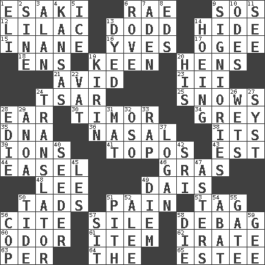 ACROSS 1. 1973 Nobel Price Winner (Physics) Leo 6. Actress Charlotte 9. Distress signal 12. Pale purple color 13. Texas town _ City 14. Flintstone garb 15. Lacking in sense or substance 16. Jacques Cousteau's middle name 17. Double curve, resembling the letter S 18. Followers of ems 19. Peachy ____! 20. Coop moms 21. Enthusiastic 23. One more than two 24. Russian ruler of old 25. Frozen precipitation (plural) 28. Hearing organ 30. The easternmost of the Lesser Sundas 34. Jennifer or Joel 35. Heredity factor (abbr.) 36. Relating to the nose 38. It is 39. Charged particles 41. Literary convention 43. Eastern Standard Time (abbr.) 44. Artist's stand 46. Pate de foie ____ 48. Area sheltered from the wind 49. Raised platform 50. Bits 51. Ache 53. Label 56. Quote 57. Drop; flow; fall 58. Debunk (Brit. slang) 60. Aroma 61. A distinct part 62. Feeling or showing extreme anger 63. For each 64. Definite Article 65. First name in cosmetics DOWN 1. Biblical high priest 2. Trig term 3. Actor Alda or Thicke 4. Sunflower state 5. Frozen water 6. Be footloose 7. Arabian gulf 8. Begley and Asner 9. Seigniories (variant) 10. Lyric poems 11. Perceive with the eye 13. Colored 14. Weeding 19. Japanese brewing company 20. Part of HMS, perhaps 22. Large container 24. Interpreter 26. Soaks 27. System (abbr.) 28. Singer Brickell 29. Small Philippine buffalo 31. Floor covering 32. Bear (Spanish) 33. Strike 37. Utah city north of Ogden 40. Sowing specialist 42. Indian title of respect (Mr.) 45. French article 47. Michaelmas daisies 49. South Vietnam president (1954) 50. Event that recurs at intervals 51. Heart or essence 52. Toward shelter 54. Blind as ____ 55. Yard entry 56. Police officer (slang) 57. Be seated 58. Pass on 59. Unit of force equal to gravity