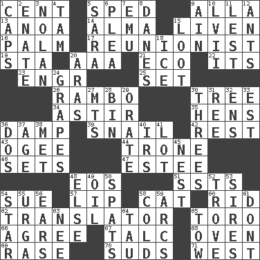 ACROSS 1. Penny 5. Moved rapidly 9. Silent film actress Nazimova 13. Small Philippine buffalo 14. _ mater 15. Make or become more lively 16. Inside of hand 17. One who advocates reunion 19. R.R. building 20. Auto club (abbr.) 21. Environmental prefix 22. It is 23. Engineer (abbr.) 25. Put into a specified state 26. Role for Stallone 30. Relationship diagram 34. Being in motion 35. Coop moms 36. Moist 39. Slow-paced one 42. Take ten 43. Double curve, resembling the letter S 44. Marketplace scale 46. Puts into a specified state 47. First name in cosmetics 48. Greek goddess of the dawn 51. Fast planes 54. Take to court 57. Mouth edge 58. Feline 60. To free from 62. Interpreter 65. "Corrida" creature 66. Match 67. Baby powder 68. Baking chamber 69. Raze (variant) 70. Beer foam 71. 270 degrees DOWN 1. Balmoral and tarboosh 2. Maternal 3. Pitcher Ryan 4. Scottish cap 5. "Two Mules for Sister ____" 6. Entreaty 7. Australian flightless bird 8. Natives or inhabitants of Denmark 9. The 18th letter of the Arabic alphabet 10. 57 in ancient Rome 11. For fear that 12. Pismires 15. Plunder 18. Frozen water 20. Ancient river in northeast Turkey 24. Raisin fruits 27. Mountains (abbr.) 28. Storage container 29. Declaim 30. Threesomes 31. To separate or throw off 32. Followers of ems 33. Eastern Standard Time (abbr.) 36. Two (Sp.) 37. Personal question 38. Was introduced to 40. Big collection agency 41. Car dealer's back yard 45. Egg locale 48. Otherwise 49. Lubricate 50. Arguments over trivial matters 52. Collection of objects 53. Titles for men of rank and authority 54. Play the lead 55. Capital and largest city of Mongolia 56. Hearing organs 58. Having a low temperature 59. Curves 61. Do not 63. Born 64. The 19th letter of the Greek alphabet 65. Pull behind