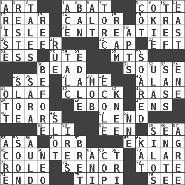 ACROSS 1. Tate display 4. Blind as ____ 8. ____ d'Azur (French Riviera) 12. Posterior 14. Bodily heat indicating an inflammation 16. Gumbo ingredient 17. Capri or Wight 18. Pleas 20. Bull 22. Head covering 23. Lizard (obsolete) 24. Curvy letter 25. Shoshoni 28. Mountains (abbr.) 30. Necklace unit 31. Lush 35. Compass dir. 37. Unable to walk 40. ____ Jay Lerner 41. Norwegian king 42. Timepiece 44. Raze (variant) 45. "Corrida" creature 46. Inky black, to poets 47. Followers of ems 48. Pulls into pieces 50. Grant temporary use of 52. Biblical high priest 54. Car or cant ending 55. Ocean 58. White ___ sheet 61. Globe 63. Supplementing with great effort 65. Act in opposition 70. Having or resembling wings 71. Hero or heavy, e.g. 72. Sir (Sp.) 73. Carryall 74. Inside; within (prefix) 75. Native american tent (variation) 76. Observe DOWN 1. Originate 2. Musical pauses 3. Lies 4. Adept person 5. Bar 6. The first octave above the treble staff 7. Torque (variant) 8. Small bed 9. Migrant worker of the '30s 10. Unclean, religiously 11. Compass direction 13. Portuguese money of account (variant) 15. 480, 500 or 516 sheets of paper 19. Flats, for short 21. Sorrow 26. Baby powder 27. Peak District village in England 29. Flew 30. Prior to 32. ____ Bator 33. Backtalk 34. Compass dir. 35. A type of plum 36. "Two Mules for Sister ____" 38. Disorderly crowd 39. Learning spot: Fr. 41. Baseball player Mel 43. Leg joint 49. Slit 51. Compass dir. 53. Angers 55. Grain storage towers 56. Maternal 57. Match 58. Measure of real estate 59. Within a short period 60. Old (Scot.) 62. Cy Young winner Saberhagen 64. Krazy ___ of comics 66. Modern: prefix 67. Black tropical American cuckoo 68. Police officer (slang) 69. Three (prefix)