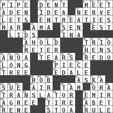 ACROSS 1. Corncob 5. Incision 9. Confront 13. Arabian gulf 14. The main thing one is thinking about 15. Boldness 16. Allows 17. Pleas 19. Spoil 20. Nanny (var.) 21. Elected rep. 22. Eastern Standard Time (abbr.) 23. Hats (slang) 25. _ tizzy (2 wds.) 26. Hold, grip (Informal) 30. Musical group of three 34. Distance measurement 35. Coop moms 36. Small Philippine buffalo 39. Pulls into pieces 42. Make new 43. Yearn 44. Component 46. Relationship diagram 47. Peak District village in England 48. Director Reiner 51. "____ silly question..." 54. Take to court 57. Atmosphere 58. Scottish cap 60. Mouth or opening 62. Interpreter 65. Independent ruler or chieftain 66. Match 67. Become fatigued 68. Collude with 69. French philosopher Descartes 70. Portico 71. General guideline DOWN 1. Inside of hand 2. Perfect 3. _ dish (used to culture cells) 4. Followers of ems 5. South Vietnam president (1954) 6. Pulitzer Prize-winning author Ferber 7. Fish or hair follower 8. Tarsus (plural) 9. Was introduced to 10. 4th largest of the Great Lakes 11. Nights before holidays 12. Trial 15. Nanny 18. Car or cant ending 20. American tennis player Robert 24. Break 27. Baseball player Mel 28. Area sheltered from the wind 29. Window treatment 30. Threesomes 31. Portuguese money of account (variant) 32. Indiana (abbr.) 33. Bear (Spanish) 36. The first octave above the treble staff 37. And not 38. Single 40. To free from 41. Ocean 45. Burrowing marine mollusk 48. To erase 49. Lubricate 50. Naughty children 52. Dried seaweed eaten as food 53. Satellite of Uranus 54. Play the lead 55. Goad 56. Merit 58. "Corrida" creature 59. Type of rug 61. Johnson of "Laugh-In" 63. Born 64. Teat (slang) 65. Hearing organ