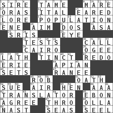 ACROSS 1. Male parent of an animal 5. Docile 9. Female horse 13. Mouths or openings 14. Slanted text style (abbr.) 15. Having ears or earlike features 16. Old wives' tales, e.g. 17. Census information 19. Compass dir. 20. Direct toward a target or goal 21. Two (Sp.) 22. White ___ sheet 23. Indian titles of respect 25. Sight organ 26. Trials 30. Give a ring to 34. Capital of Egypt 35. Double curve, resembling the letter S 36. Thin strip of wood or metal 39. Tinged 42. Make new 43. One of the Great Lakes 44. Bee-related 46. Puts into a specified state 47. The wife of a rajah (variant) 48. Director Reiner 51. Pledge 54. Institute legal proceedings 57. Atmosphere 58. Layer 60. Auto club (abbr.) 62. Interpreter 65. Inky black, to poets 66. Match 67. Through, poetically 68. Spanish pot 69. Political cartoonist Thomas 70. Oceans 71. Sew up the eyelids of hawks and falcons DOWN 1. Not divided or shared with others 2. Metal shackles 3. More uncommon 4. Compass dir. 5. Native american tent (variation) 6. Tiny particle 7. Atlas unit 8. Dodge 9. Floor protector 10. Operatic vocal solo 11. Vintage cars 12. Pulitzer Prize-winning author Ferber 15. Comfort 18. Myrna of the movies 20. At sea 24. Strong, restless desires 27. Be seated 28. Three (prefix) 29. Echolocation 30. Pupil covering 31. Mature 32. Directed 33. Lion 36. French article 37. "We ___ not amused" (Victoria) 38. Teat (slang) 40. Tax preparer (abbr.) 41. Metal container 45. Period of immesurable duration 48. Raze (variant) 49. Lubricate 50. Naughty children 52. Eating place 53. White Person, in Hawaii 54. Comedian Laurel of Laurel & Hardy 55. Capital and largest city of Mongolia 56. Hearing organs 58. Israeli folk dance 59. Greek god of love 61. Of or related to the anus 63. Fish or hair follower 64. Definite Article 65. Greek goddess of the dawn