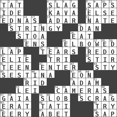 ACROSS 1. Make lace 4. Volcanic refuse 8. Plant excrements 12. Binary compound 13. Polynesian shrub of the pepper family 14. Otherwise 15. Ferber et al. 18. The sixth month of the Jewish calendar 19. Nathan's nickname 20. Slender, wiry 22. One of the 12 tribes of Israel 23. Portico 24. Erode 25. Followers of ems 26. Shoved, as through a crowd 30. Pet locale 33. Separates forcefully 36. Do over again 37. Writer Wiesel 39. Three (prefix) 40. Disorderly outburst 41. Adolescent 42. Keyboard key 44. Filthy place 45. French poetic form 47. A really long time 50. To free from 51. First of billions? 53. Luau accessory 54. Devices for capturing images 57. Greek goddess of the earth (variant) 59. Messy guy 61. Lean end of the neck 63. Part of Q.E.F. 64. Jacques of French films 65. Attempt to accomplish something 66. Suggestive of the supernatural 67. Collude with 68. Plant excrement DOWN 1. Standoff 2. Sums up 3. Portable shelters 4. Heroin 5. Kenny Rogers chart-topper in '80 6. Actress Gardner 7. Slender fish 8. Elected representatives 9. ____ Jay Lerner 10. Pacific Standard Time (abbr.) 11. Perceive with the eye 16. Johnson of "Laugh-In" 17. The Jewish people; Israel 21. Political cartoonist Thomas 22. Pat or tap gently 24. Raised railways 26. 4th largest of the Great Lakes 27. Moistens 28. Prepare for publication 29. Dinghy 30. Allows 31. Toward shelter 32. Sliced desserts 34. Inactive volcano in Sicily 35. Nonscientific branch of learning 38. Plea 42. Conclude 43. 480, 500 or 516 sheets of paper 46. One more than two 48. Lyric poems 49. Drug cop 52. Shops 53. One who doesn't tell the truth 54. ____ d'Azur (French Riviera) 55. "This won't hurt ____!" 56. "Two Mules for Sister ____" 57. Turn to the right 58. "We ___ not amused" (Victoria) 59. R.R. building 60. Experiment locale 62. Hustle