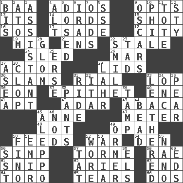 ACROSS 1. Sound made by sheep 4. Goodbye (Sp.) 9. Chooses 13. ___ a Wonderful Life 14. Titled peers of a realm 15. Went for two points 16. Mayday 17. Sadhe (variant) 18. Municipality 19. Russian fighter aircraft 21. Followers of ems 22. Having lost freshness 24. Downhill vehicle 26. Third mo. 27. Thespian 29. Flaplike coverings 30. Criticizes harshly 31. Monetary unit of Yemen 33. Chop off 36. A really long time 37. Curse 40. Compass dir. 41. Fitting 42. The sixth month of the Jewish calendar 43. Phillipine bananalike plant 45. Queen of England 1702-14 47. Distance measurement 48. Car dealer's back yard 49. Brightly colored fish 50. Eats 52. Armed conflict 54. Lair 56. Simple or foolish person 57. Singer Mel 59. Actress Charlotte 61. Sever or remove by pinching or nipping 62. Satellite of Uranus 63. Conclusion 64. "Corrida" creature 65. Pulls apart 66. Two (Sp.) DOWN 1. Altar cloth linen 2. Tiny particle 3. Aide 4. Keyboard modifier key 5. Administered medicine 6. SW Asia republic 7. Probability 8. Compass dir. 9. Motion picture awards 10. Silvers or Donahue 11. Haul 12. Filthy place 20. Take by theft 22. Grin 23. Small boy 25. Celtic language 27. Toward the sea 28. Hoof sound 29. Cowardly lion portrayer 31. Travel on or in a vehicle 32. Call ___ day 33. Resembling or made to resemble leather 34. Single time 35. Lightbulb-shaped fruit 38. Leg coverings 39. Pack (down) 44. Necklace unit 45. City in Syria 46. Dreamland 49. Abalone 50. Fine (Spanish) 51. Independent ruler or chieftain 52. Had on 53. Roberta Peters solo 55. Billionth: prefix 56. Fast jet (abbr.) 57. Make lace 58. Raised railways 60. Begley and Asner