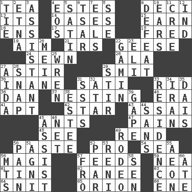 ACROSS 1. Beverage made from leaves 4. _____ Park, CO 9. Tenth: prefix 13. It is 14. Fertile tracts in a desert 15. Merit 16. Followers of ems 17. Lacking originality or spontaneity 18. Flintstone 19. Direct toward a target or goal 21. Big collection agency 22. Honkers 24. Stitched 26. In the manner of 27. Having gotten out of bed 29. Stricken, poetically 30. Silly 31. Suttee (variant) 33. To free from 36. One of the 12 tribes of Israel 37. Inhabiting a nest 40. Period 41. Fitting 42. Play the lead 43. Slender Brazilian palm 45. Pismires 47. Aches 48. Observe 49. Tear apart 50. Thick mixture 52. Adept person 54. Ocean 56. Wise men 57. Gives food to 59. Teachers' org. 61. Airtight sealed metal containers 62. Indian princess (variant) 63. Small bed 64. In a ____ (agitated or irritated) 65. Greek mythologigal hunter 66. Compass dir. DOWN 1. Standoff 2. Inactive volcano in Sicily 3. Aide 4. Greek goddess of the dawn 5. Smooth fabric 6. Russian ruler of old 7. Snakelike fish 8. Compass dir. 9. Outscore 10. Hearing organs 11. Algonquian 12. Indiana (abbr.) 20. Chow _ 22. Street urchin 23. Biblical high priest 25. Songbird 27. Opera by Verdi 28. Fastener 29. Disorderly outburst 31. Fast planes 32. "One Day ___ Time" 33. Dwelling 34. SW Asia republic 35. Raised platform 38. First name in cosmetics 39. Stare wonderingly 44. Without 45. Help 46. Fish or hair follower 49. Cowboy competition 50. Ache 51. Hindu god of fire 52. Lightbulb-shaped fruit 53. Painter Guido (1575-1642) 55. Age 56. Mountains (abbr.) 57. Away 58. Elected rep. 60. Had dinner