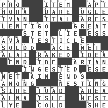 ACROSS 1. Adept person 4. A whole individual unit 8. Fitting 11. Israeli folk dance 13. Have the gumption 14. Stare at amorously 15. "Terrible" tsar 16. Slanted text style (abbr.) 17. Ancient Greek god of war 18. Small, flat, pigmented spot on the skin 21. Relatively large 22. Proofreading order 23. Untruth 25. Double-curved letter 26. Actress Gardner 29. A testis 32. Twentieth part of a lira 34. Adept person 35. Was introduced to 38. Mountain range southwest of Kyrgyzstan 39. Moved through 41. The main thing one is thinking about 43. Conclusion 44. Binary compound 45. Believer in; advocate of (suffix) 46. Eaten 50. Compass dir. 51. Fish or hair follower 54. The 18th letter of the Arabic alphabet 55. Extremities 57. Amid 59. Inhabiting a nest 63. Male parent of an animal 64. Frog relative 67. Length times width 68. _ mater 69. Small island 70. Egg locale 71. Sodium hydroxide 72. Lacking warmth 73. A female animal or person DOWN 1. Silvers or Donahue 2. Be footloose 3. NW Algerian seaport 4. Foolish or stupid persons 5. Make lace 6. Epoch 7. Cartoonist voice _ Blanc 8. Match 9. Entreaties 10. Trials 12. Pismires 14. Boat paddle 19. "Tell ____ the Marines!" 20. Unit of force equal to gravity 21. Set 23. Louse (plural) 24. On the rocks 26. White ___ sheet 27. Short-tailed, large-bodied rat 28. Actor Alda or Thicke 30. Proceeds 31. Arab leader 33. "You Light Up My Life" star Conn 36. Singer Brickell 37. Afternoon social gatherings 39. Swiss mountan, "Queen of the Mountains" 40. Arabian gulf 42. One (Scot) 45. Sums up 47. Tired old horse 48. Looked after 49. Compass dir. 51. Rhinal 52. Poet Dickinson 53. Singer Mel 56. Comedian Laurel of Laurel & Hardy 58. Teachers' org. 60. Angers 61. Soft 62. Yard entry 64. Nervous spasm 65. Bear (Spanish) 66. 100%