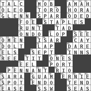 ACROSS 1. Baby powder 5. Crowd into 8. Housemaid 12. Margarine 13. "Corrida" creature 15. Israeli folk dance 16. American astronaut and politician John 18. Practice fight 19. Wrote a lyric poem 20. Enemy 22. Paper fasteners 24. Undersized animal 26. Small boy 27. Southwest Nigerian state 28. Chop off 29. Observe 32. Sign of things to come 35. Austrian river, tributary to the Danube 37. Island 38. Stupid person 39. Infant locale 40. Have the gumption 41. Raised railways 42. Back-to-school mo. 43. Lodging establishments 44. To separate or throw off 45. Teat (slang) 46. Washington bills 49. Snakelike fish 50. Sweet dark-red dessert wine 51. Pre-World Series prize 55. River (Sp.) 56. "Two Mules for Sister ____" 57. Island territory of the United States 59. Bert's buddy 63. Blemish 64. Inside; within (prefix) 65. Look after 66. Relaxation 67. Compass dir. 68. Oceans DOWN 1. Coat; cloak 2. 100% 3. Area sheltered from the wind 4. Meet 5. Mountains (abbr.) 6. I made a mistake 7. Naughty child 8. Hold, grip (Informal) 9. Method 10. Ancient Greek god of war 11. Possessed 14. Speaker 17. Part of speech 21. Conclusion 23. Infant food 25. Bathroom plumbing fixture 28. Portable computer 29. Glance over 30. Merit 31. Sight organs 32. River in Europe 33. Undercover agent 34. Otherwise 36. Plant excrement 40. What propaganda does 42. Fodder prepared in a silo 45. "___ Little Indians" 47. Not either 48. One of the Great Lakes 49. Maternal 51. Dad 52. Greek god of love 53. Religious women 54. Small boys 56. Compass dir. 58. Cut the grass 60. Born 61. _ tizzy (2 wds.) 62. Begley and Asner