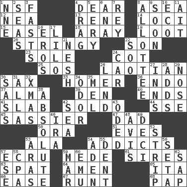 ACROSS 1. Science/research agcy. 4. Letter starter 8. At sea 12. Teachers' org. 13. French philosopher Descartes 14. Event scenes 15. Artist's stand 18. Like ___ of sunshine 19. Plunder 20. Slender, wiry 22. Boy, to dad 23. Flatfish 24. Small bed 25. Mayday 26. Of or relating to Laos or its people 30. Saxophone 33. Simpsons dad 36. Inside; within (prefix) 37. _ mater 39. Lair 40. Extremities 41. Broad, flat, thick piece 42. Twentieth part of a lira 44. Compass dir. 45. More lively and spirited 47. June honoree 50. Mouth or opening 51. Nights before holidays 53. Wing 54. Inveterate users 57. Shade of tan 59. Ancient Persian 61. Fathers 63. Petty quarrel 64. So be it 65. Call ___ day 66. Relaxation 67. The smallest animal of a litter 68. Infant food DOWN 1. Compass dir. 2. Oceans 3. Goes without food and/or water 4. To draw with force 5. Suggestive of the supernatural 6. Santa ___, CA 7. Marina Del _, California 8. One to whom something is allotted 9. Within a short period 10. Environmental prefix 11. Small island 16. Greek god of love 17. _ and Stitch 21. Soft 22. "Barney Miller" actor Jack 24. Auto 26. Grant temporary use of 27. Restaurants 28. Sums up 29. Sense of smell 30. Backtalk 31. Silent film actress Nazimova 32. Dec. holiday 34. Aroma 35. Cartoonist voice _ Blanc 38. Utter; complete 42. Ocean 43. Wrote a lyric poem 46. Retirement account (abbr.) 48. Opinion 49. Tenth: prefix 52. Long narrow piece of something 53. Ancient river in northeast Turkey 54. An important port of Yemen 55. Incision 56. Stalk of a moss capsule 57. Compass dir. 58. Numbers guy (abbr.) 59. Impair 60. Australian flightless bird 62. Plant excrement