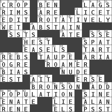 ACROSS 1. Riding implement 5. Benjamin's nick name 8. Falls behind 12. Basketball hoops 13. "We ___ not amused" (Victoria) 14. It is permitted: Lat. 15. Prepare for publication 16. Happening in regular succession 19. Dripping 20. Choose not to consume 21. Fast planes 23. Had dinner 24. Compass dir. 27. Behest 30. Argument over a trivial matter 31. Artist's stands 34. Small pie 35. Confederate soldiers (slang) 38. Grayish beige 40. Roberta Peters solo 41. Legendary monster 42. Wanderer 44. Prejudice 45. Naked 46. Eastern Standard Time (abbr.) 47. Small island 50. Celtic language 53. "Death Wish" actor 57. Increase 59. Census information 63. Trig term 64. Related on the mother's side 65. Falsehood 66. ____ Jay Lerner 67. French philosopher Descartes 68. Raised railways 69. Inconspicuous attention getter DOWN 1. Group working together 2. Amusement-park features 3. Leaves out 4. Pacific Standard Time (abbr.) 5. Sharp remark 6. Greek god of love 7. Remaining after all deductions 8. 54 in ancient Rome 9. Adept person 10. Set 11. Filthy place 14. Actor's bit 17. Auto club (abbr.) 18. Teat (slang) 20. Toward the sea 22. College papers 24. Practice fight 25. Indian skirt 26. Singer James 28. Fast jet (abbr.) 29. Pull apart 30. A viewer who gazes fixedly 32. Nilotic language 33. Connect, as a bridge 35. Loose flowing garment 36. Armor plate that protects the chest 37. Naughty child 39. Australian flightless bird 43. Locale of original sin 47. Competent 48. Lyricist Gershwin 49. Small child 51. Travel by water 52. Ferber et al. 54. The longest river in the world 55. Earth 56. Washington bills 58. Scratch 59. For each 60. Single 61. Baking dish 62. Shoshoni 63. Plant excrement