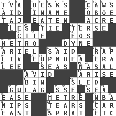 ACROSS 1. Federal power corp. 4. Writing tables 9. Crow sounds 13. Assist 14. Lacking in sense or substance 15. Mitch Miller's instrument 16. _ Mahal 17. Ingested 18. 43,560 square feet 19. French article 21. Standoff 22. Laconic 24. Quote 26. Greek goddess of the dawn 27. Paris' subway 29. Centimeter-gram-second unit of force 30. Satellite of Uranus 31. Expressed in words 33. Strike 36. 54 in ancient Rome 37. Normal relaxed breathing 40. Period 41. Area sheltered from the wind 42. Oceans 43. Relating to the nose 45. Enthusiastic 47. Originate 48. Storage container 49. Downhill vehicle 50. Russian prison camp 52. Compass dir. 54. Ocean 56. Comfort 57. Distance measurement (Brit.) 59. Basketball assoc. 61. Cuts off 62. Separates forcefully 63. Automobile 64. 90 degrees 65. Small fatty European fish 66. And so on (abbr.) DOWN 1. Make lace 2. Small bottle 3. Descriptive word 4. Expire 5. Related on the mother's side 6. Suttee (variant) 7. Leg joint 8. Elected rep. 9. Rough 10. Lettered men learn these first 11. Had on 12. Perceive with the eye 20. Beget 22. Miss Universe 1986, Barbara Palacios _ 23. Age 25. Lacquered or enameled metalware 27. Shopping center 28. One of the Great Lakes 29. "Vaya con ____" 31. Drove too fast 32. Santa ___, CA 33. Home 34. Caspian sea tributary 35. Diluted with white 38. Exploiting 39. Of or related to the anus 44. Ancient Greek god of war 45. Most capable 46. By way of 49. Spanish missionary in California 50. Greek goddess of the earth (variant) 51. United States Postal Service (abbr.) 52. Ooze 53. Play the lead 55. Blind as ____ 56. Compass dir. 57. Mountains (abbr.) 58. Eastern Standard Time (abbr.) 60. Curve