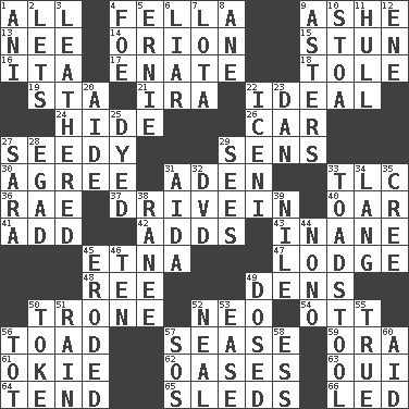 ACROSS 1. Everything 4. Man or boy (slang) 9. American tennis player Robert 13. Born 14. Greek mythologigal hunter 15. Astound 16. Call ___ day 17. Maternal 18. Lacquered or enameled metalware 19. R.R. building 21. Lyricist Gershwin 22. Perfect 24. Flintstone garb 26. 4-wheeled motor vehicle 27. Sleazy 29. Elected reps. 30. Match 31. Arabian gulf 33. Affectionate concern, for short 36. Actress Charlotte 37. Popular '50s hangout 40. Boat paddle 41. Find the sum of 42. Sums up 43. Empty; void 45. Inactive volcano in Sicily 47. Cabin 48. Portuguese money of account (variant) 49. Lairs 50. Marketplace scale 52. Modern: prefix 54. Baseball player Mel 56. Frog relative 57. Gospel singer Marvin 59. Mouth or opening 61. Migrant worker of the '30s 62. Fertile tracts in a desert 63. Fr. "Yes" 64. Look after 65. Bobsleighs 66. Directed DOWN 1. Cuckoo 2. Allows 3. Resembling or made to resemble leather 4. Enemy 5. Bert's buddy 6. One who doesn't tell the truth 7. Globular water bottle used in Asia 8. One (Scot) 9. Michaelmas daisies 10. Portico 11. Frame or body of a ship 12. Compass dir. 20. Helper 22. Ancient Celtic tribe of eastern Britain 23. One of the 12 tribes of Israel 25. Colored 27. "Two Mules for Sister ____" 28. Mild oath 29. Observes 31. Opera by Verdi 32. Movie disc 33. Inedible or poisonous agaric 34. Long (Scottish) 35. Algonquian 38. The wife of a rajah (variant) 39. "Death on the ____" 44. Words to Nanette 45. Eaten away 46. Nine, plus one 49. Administered medicine 50. Puff or smoke 51. Water falling in drops from the sky 52. Be tempered by heat 53. Relaxation 55. Loyal 56. Small child 57. Distress signal 58. Curvy letter 60. Assist