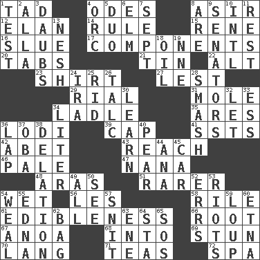 ACROSS 1. Small amount or degree 4. Lyric poems 8. SW Saudi Arabia district 12. Liveliness 14. Governing power 15. French philosopher Descartes 16. Change direction abruptly 17. Pieces 20. Bar bills 21. Metal container 22. Keyboard modifier key 23. Upper-body garment 27. For fear that 29. Monetary unit of Yemen 31. Undercover agent 34. Dipping utensil 35. Ancient Greek god of war 36. Farming town in central California 39. Head covering 41. Fast planes 42. Collude with 43. Arrive at 46. Diluted with white 47. Grandmother 48. Ancient river in northeast Turkey 51. More valued for its uncommonness 54. Dripping 56. French article 58. Cause heat under the collar 61. The property of being fit to eat 66. Carrot, for example 67. Small Philippine buffalo 68. To the inside or interior of 69. Make senseless or dizzy 70. Long (Scottish) 71. Beverages made from leaves 72. Health resort DOWN 1. Trial 2. Silent film actress Nazimova 3. Applies to a surface 4. The grampus (Milton) 5. Superhero pair 6. Shade tree 7. Back-to-school mo. 8. "We ___ not amused" (Victoria) 9. Legislators 10. International (abbr.) 11. Relief 13. Delicate 18. Petroleum 19. Compass dir. 24. Retirement account (abbr.) 25. To free from 26. Baby powder 28. Box-office sellout 30. Memorize 32. Allow 33. Curvy letter 34. 61 cubic inches 36. Infant locale 37. Chief or king in Benin or Nigeria 38. Conveyance 40. Lightbulb-shaped fruit 44. Santa ___, CA 45. Auto 49. Everything 50. Observe 52. Blunders 53. Disturbances 54. Welt 55. Pulitzer Prize-winning author Ferber 57. In a ____ (agitated or irritated) 59. Central Nebraska county 60. Inactive volcano in Sicily 62. Paper or plastic container 63. Compass dir. 64. R.R. building 65. Distress signal