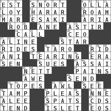 ACROSS 1. Eastern Standard Time (abbr.) 4. Derisive sound 9. Rounded earthenware pot or jar 13. Myrna of the movies 14. Ethiopian city, capital of Harari 15. Wander 16. Spoil 17. 1973 Nobel Price Winner (Physics) Leo 18. Operatic vocal solo 19. Director Reiner 21. One (Scot) 22. Moving about 24. Give a ring to 26. Corporate head (abbr.) 27. Place in a line 29. Play the lead 30. Amusement-park features 31. Edible starchy tuberous root 33. To free from 36. Cuckoo 37. Pulling into pieces 40. Period 41. Elected rep. 42. Takes to court 43. Slender Brazilian palm 45. Remaining after all deductions 47. Aches 48. Deep reverence 49. Transmit 50. Drinks excessively 52. Leather borer 54. Perceive with the eye 56. Pack (down) 57. Entreaties 59. Compass dir. 61. Toward shelter 62. Arguments over trivial matters 63. Music discs 64. Watch over 65. Small island 66. Greek goddess of the dawn DOWN 1. Shade tree 2. Fly high 3. Polypeptide antibiotic 4. A female animal or person 5. Rhinal 6. Northwest Algerian city 7. Immoral or dissolute person 8. Three (prefix) 9. Speaker 10. Australian parrot (variant) 11. Den 12. Nanny (var.) 20. Object of repulsion 22. NE Massachussets city 23. Ocean 25. For fear that 27. Ancient river in northeast Turkey 28. Actor's bit 29. Indian titles of respect 31. Drawn tight 32. "We ___ not amused" (Victoria) 33. Home 34. SW Asia republic 35. Raised platform 38. _____ Park, CO 39. Yawn 44. Without 45. Slept 46. She-sheep 49. Chalkboard 50. Story 51. Presage 52. High mountains 53. Welt 55. Inside; within (prefix) 56. Make lace 57. 23rd letter of the Greek alphabet 58. Fast jet (abbr.) 60. Curvy letter