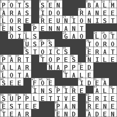 ACROSS 1. Cooking vessels 5. Elected rep. 8. Lip ointment 12. Ancient river in northeast Turkey 13. Wedding promise 14. The wife of a rajah (variant) 15. Old wives' tales, e.g. 16. One who advocates reunion 19. Followers of ems 20. Pre-World Series prize 21. Petroleums 23. E Mali city 24. Car dealer's back yard 27. United States Postal Service (abbr.) 30. "Corrida" creature 31. Unemotional ones 34. Part of Q.E.F. 35. Piece 38. Drinks excessively 40. Mediterranean tributary 41. Having or resembling wings 42. Slept 44. Globular water bottle used in Asia 45. Lie 46. Perceive with the eye 47. Enemy 50. The main thing one is thinking about 53. Heighten or intensify 57. Keyboard modifier key 59. Supplementary 63. 4th largest of the Great Lakes 64. First name in cosmetics 65. Baking dish 66. French philosopher Descartes 67. Pull into pieces 68. Conclusion 69. Arabian gulf DOWN 1. Diluted with white 2. U. of Maine site 3. Tarsus (plural) 4. Compass dir. 5. Father 6. Locale of original sin 7. Part of speech 8. Bar 9. Cuckoo 10. French article 11. Was introduced to 14. Printing process, for short 17. Tired old horse 18. _ tizzy (2 wds.) 20. Inconspicuous attention getter 22. A period of five years 24. Australian parrot (variant) 25. Taken by mouth 26. Carryall 28. Cooking vessel 29. The Jewish people; Israel 30. Watched over 32. Tax preparer (abbr.) 33. Back-to-school mo. 35. Friends 36. Medicinal plant 37. Assign a rank or rating to 39. Health resort 43. Writer Wiesel 47. Do some clerical work 48. Single 49. Eastern Standard Time (abbr.) 51. Having ears or earlike features 52. Place in a line 54. Corncob 55. "Terrible" tsar 56. Tear apart 58. Adolescent 59. Arrange properly for use 60. Purpose 61. Parent Teacher Assoc. 62. For each 63. Epoch