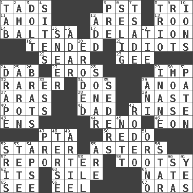ACROSS 1. Small amounts or degrees 5. Pacific Standard Time (abbr.) 8. Three (prefix) 11. Mine, in Marseilles 12. Ancient Greek god of war 13. Friend of Pooh 14. Greek mezzo-soprano Agnes 17. Accusation by an informer 19. Looked after 21. Foolish or stupid persons 22. Dry up 23. Turn to the right 24. Apply (a substance) by light strokes 27. Greek god of love 29. Naughty child 32. Less widely known 34. Two (Sp.) 36. Small Philippine buffalo 37. Caspian sea tributary 38. Compass dir. 39. Political cartoonist Thomas 40. Plant holders 41. June honoree 42. Wash lightly 43. Followers of ems 44. Former U.S. Attorney General Janet 46. Age 47. Parent Teacher Association (abbr.) 50. Do over again 52. A viewer who gazes fixedly 55. Michaelmas daisies 57. News announcer 59. Tootsie (variant) 62. It is 63. Drop; flow; fall 64. Nathan's nickname 65. Observe 66. Snakelike fish 67. Mouths or openings DOWN 1. Keyboard key 2. Nanny (var.) 3. Stupid person 4. Locates 5. Before (prefix) 6. Major League Baseball Commissioner Bud 7. Sadhe (variant) 8. Musical group of three 9. Carrot, for example 10. Charged atoms 12. Say or write further 15. Scornful expression 16. The sixth month of the Jewish calendar 18. Make a knot 20. Worn away 24. Window treatment 25. Composer Copland 26. Naughty children 28. Underwater navigation system 29. Empty; void 30. With motion or animation 31. Eucharist need 33. Double-curved letter 35. Spring feasts 36. Cuckoo 42. Cowboy competition 45. Remaining after all deductions 47. Adept person 48. Laconic 49. Nick name for Arthur 51. U. of Maine site 52. Indian titles of respect 53. False hair 54. Domed church section 55. "We ___ not amused" (Victoria) 56. Play the lead 58. Pipe bend 60. R.R. building 61. It is so
