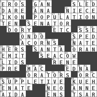 ACROSS 1. Greek god of love 5. Separate the seeds from cotton 8. Downhill vehicle 12. Have the gumption 13. Santa ___, CA 14. Sibling's daughter 15. Picture 16. Census information 19. "___ Little Indians" 20. Legislator 21. Small, narrow, flatbottom fishing boat 23. And so on (abbr.) 24. Compass dir. 27. Southwest Nigerian state 30. Broke a traffic law 31. Oak nuts 34. Nathan's nickname 35. Possessive pronoun 38. Before Barbara or Clara 40. NW Algerian seaport 41. Give off 42. Manatee 44. Flaplike coverings 45. French philosopher Descartes 46. Before (prefix) 47. Big _ 50. Pulitzer Prize-winning author Ferber 53. Speakers 57. The grampus (Milton) 59. Supplying deficiencies 63. Malaysian steamed pastry 64. Maternal 65. Modern: prefix 66. Queen of England 1702-14 67. Opera by Verdi 68. Followers of ems 69. Russian ruler of old DOWN 1. Prepare for publication 2. Swept the length of 3. U. of Maine site 4. Elected rep. 5. Yawn 6. At once, immediately (arch.) 7. California wine valley 8. Be seated 9. Flowery wreath 10. Environmental prefix 11. Lair 14. Drug cop 17. Shoshoni 18. Car dealer's back yard 20. Synchronize (abbr.) 22. Cooks with dry heat, as in an oven 24. Practice fight 25. Stalk of a moss capsule 26. Paradise 28. Two (Sp.) 29. Mouths or openings 30. Frozen precipiation fell 32. Compass dir. 33. Play the lead 35. Assist 36. Arab leader 37. Travel on or in a vehicle 39. Adept person 43. Singles 47. Undercover agent 48. "We ___ not amused" (Victoria) 49. Feline 51. Parts of speech 52. Sports stadium 54. Prong on a fork 55. Baking chamber 56. Vintage cars 58. "Mermaids" star 59. Ocean 60. Single; one (prefix) 61. Writing tablet 62. Parent Teacher Association (abbr.) 63. Krazy ___ of comics