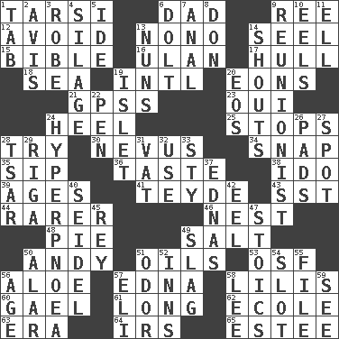 ACROSS 1. Tarsus (plural) 6. Male parent 9. To riddle 12. Prevent the occurrence of 13. Words to Nanette 14. Sew up the eyelids of hawks and falcons 15. Instruction Manual for Humans 16. ____ Bator 17. Frame or body of a ship 18. Ocean 19. International (abbr.) 20. Immeasurably long periods of time 21. Global Positioning Systems (abbr.) 23. Fr. "Yes" 24. The bottom of a shoe or boot 25. Discontinues 28. Attempt 30. Mole, birthmark 34. Fastener 35. Small drink 36. Clothes sense 38. Wedding promise 39. Ripens 41. Miss Universe 1986, Barbara Palacios _ 43. Fast jet (abbr.) 44. Less widely known 46. Egg locale 48. Sliced dessert 49. Table seasoning 50. Actor Griffith 51. Lubricates 53. Order of Saint Francis (abbr.) 56. _ vera 57. Pulitzer Prize-winning author Ferber 58. Ms. Damita and namesakes 60. Highlander 61. Protracted 62. Learning spot: Fr. 63. Epoch 64. Big collection agency 65. First name in cosmetics DOWN 1. Bar bill 2. Opinion 3. Loose flowing garment 4. Fodder prepared in a silo 5. Binary compound 6. Stupid person 7. Of or related to the anus 8. Spanish title 9. One who advocates reunion 10. Snakelike fish 11. Pipe bend 13. Religious women 14. Yells 19. Small island 20. Greek goddess of the dawn 22. Animal enclosure 24. Abnormally rapid or deep breathing 26. Writing tablets 27. Specific locale 28. Russian ruler of old 29. Capital of Latvia 31. Large container 32. Purpose 33. Filthy place 37. Ferber et al. 40. Beer mug 42. Snakelike fish 45. Marina Del _, California 47. Unemotional ones 49. Volcanic refuse 50. Having or resembling wings 51. Scent 52. Restaurants 54. Slit 55. Do some clerical work 56. Grow older 57. Connecticut Ivy Leaguer 58. Area sheltered from the wind 59. Observe